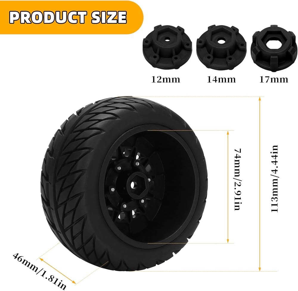 Product Dimensions - The dimensions of our 1/10 scale RC truck buggy tires are as follows: Tire Diameter (Height): 4.44" (113mm); Wheel Diameter: 2.92" (74mm); Width: 1.81" (46mm); Hex: 12mm/14mm/17mm. Please confirm that our RC tires and wheels fit your requirements before purchase it