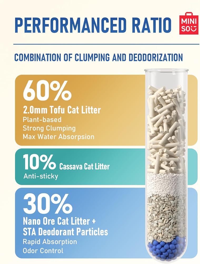 【Mixed Natural Ingredients】60% tofu+28% bentonite+10% cassava+2% STA deodorant particles, ensuring great clumping, scent control, and easy to scoop.