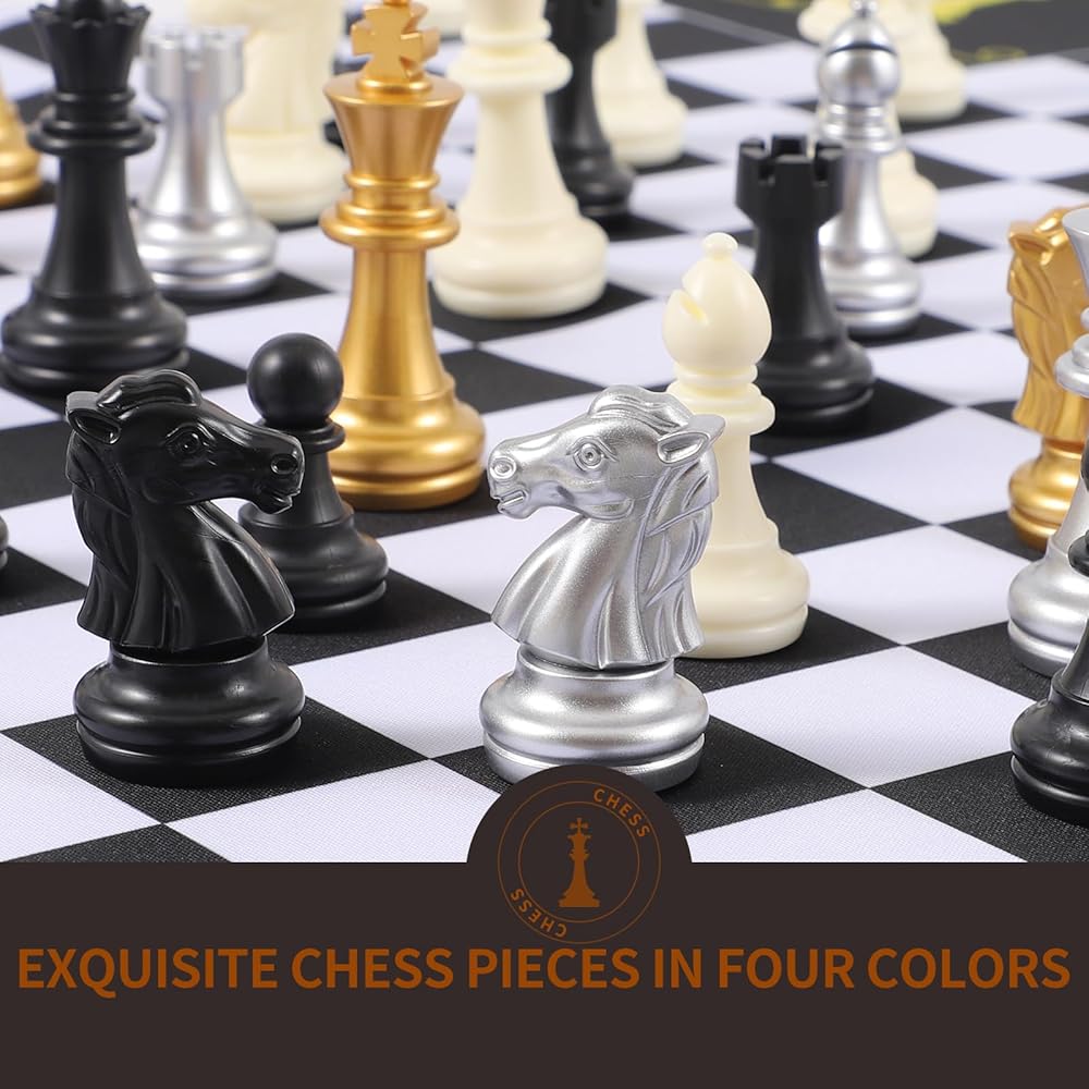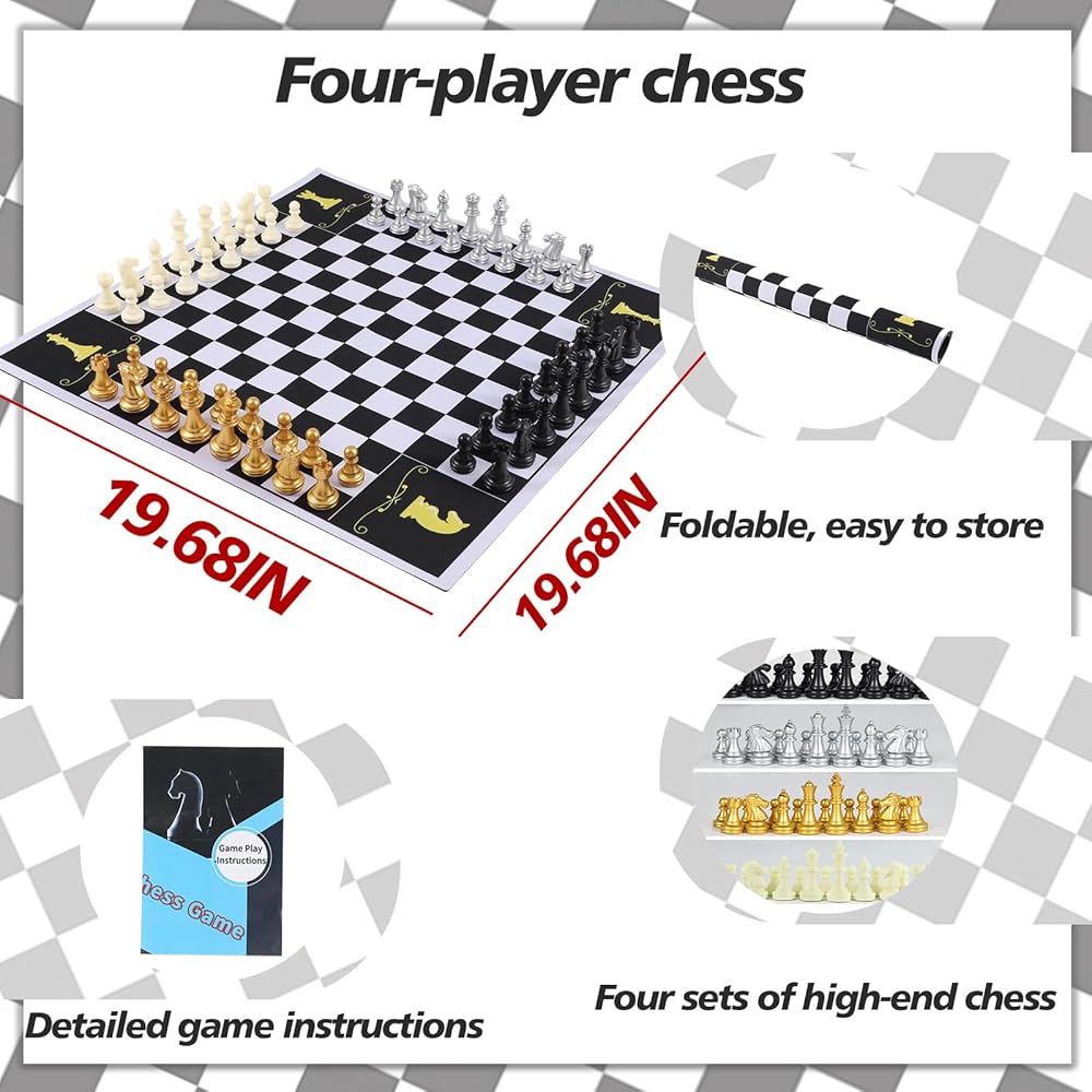 [Upgraded Version Of Chess] Four-player chess takes your chess skills to a new level, increasing the number of opponents from 1 to 3 and allowing for more intense battles with your friends. The board features a double-sided design, with one side being a two-player board and the other side being a four-player board, suitable for both chess beginners and advanced players. Everyone will be amazed by the fact that it allows for simultaneous gameplay with four players!