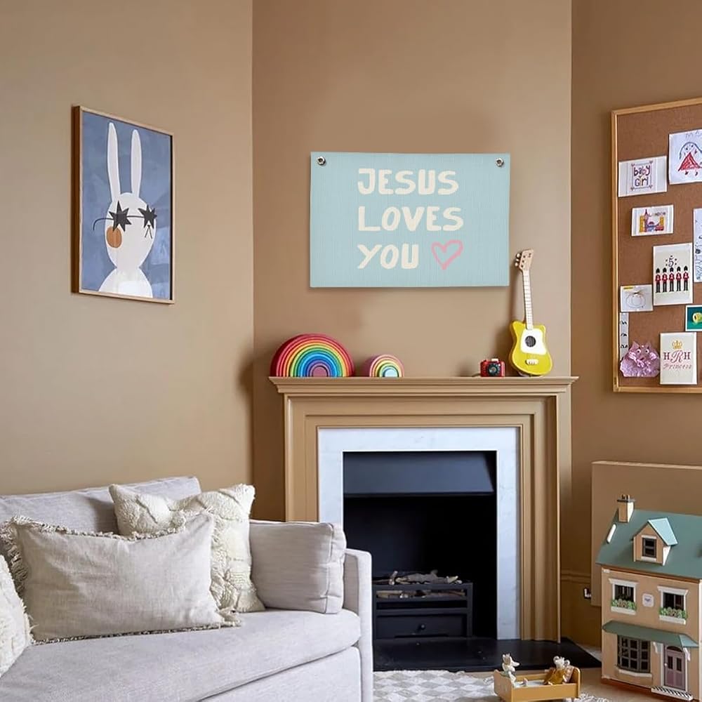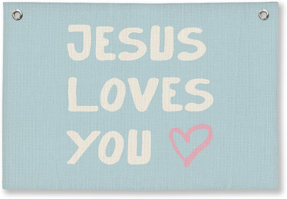 Bible Verse Wall Decor, Christian Nursery Room Decor Kids, Jesus Room Decor, Jesus Love You Blue Christian Wall Hanging Linen Banner, 20x30 Inch