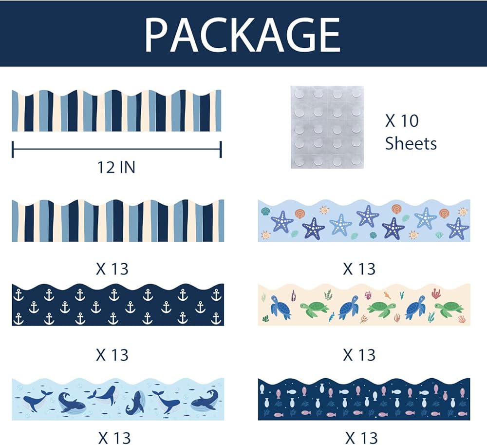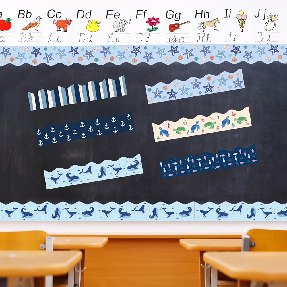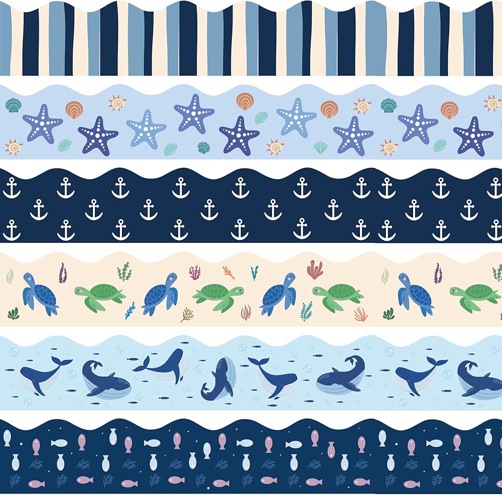 75Ft Ocean Bulletin Board Borders Summer Sea Themed Scalloped Trim Turtle Whale Fish Bulletin Borders Back to School Boho Classroom Home Office Chalkboard Wall Door Decorations for Summer Beach Pool