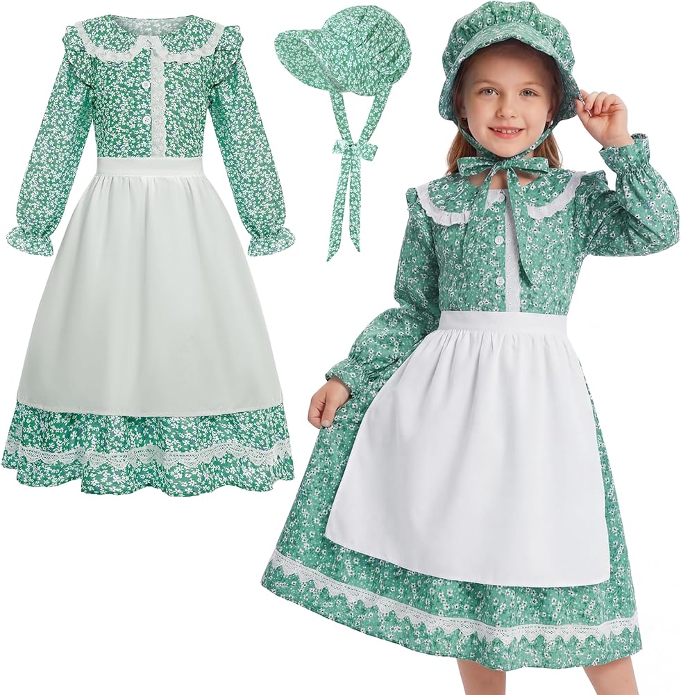 Pioneer Costume for Girls:This Pioneer Costume Set includes vintage floral dress with matching hat and apron. The beautifully crafted dresses and abundance of accessories make it ideal for any budding colonial girl, perfect for girls who love to dress up and embrace the spirit of adventure.