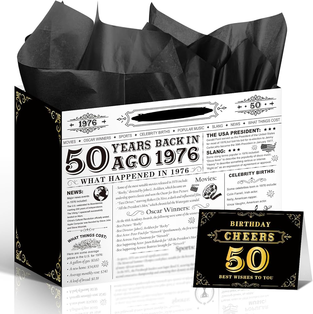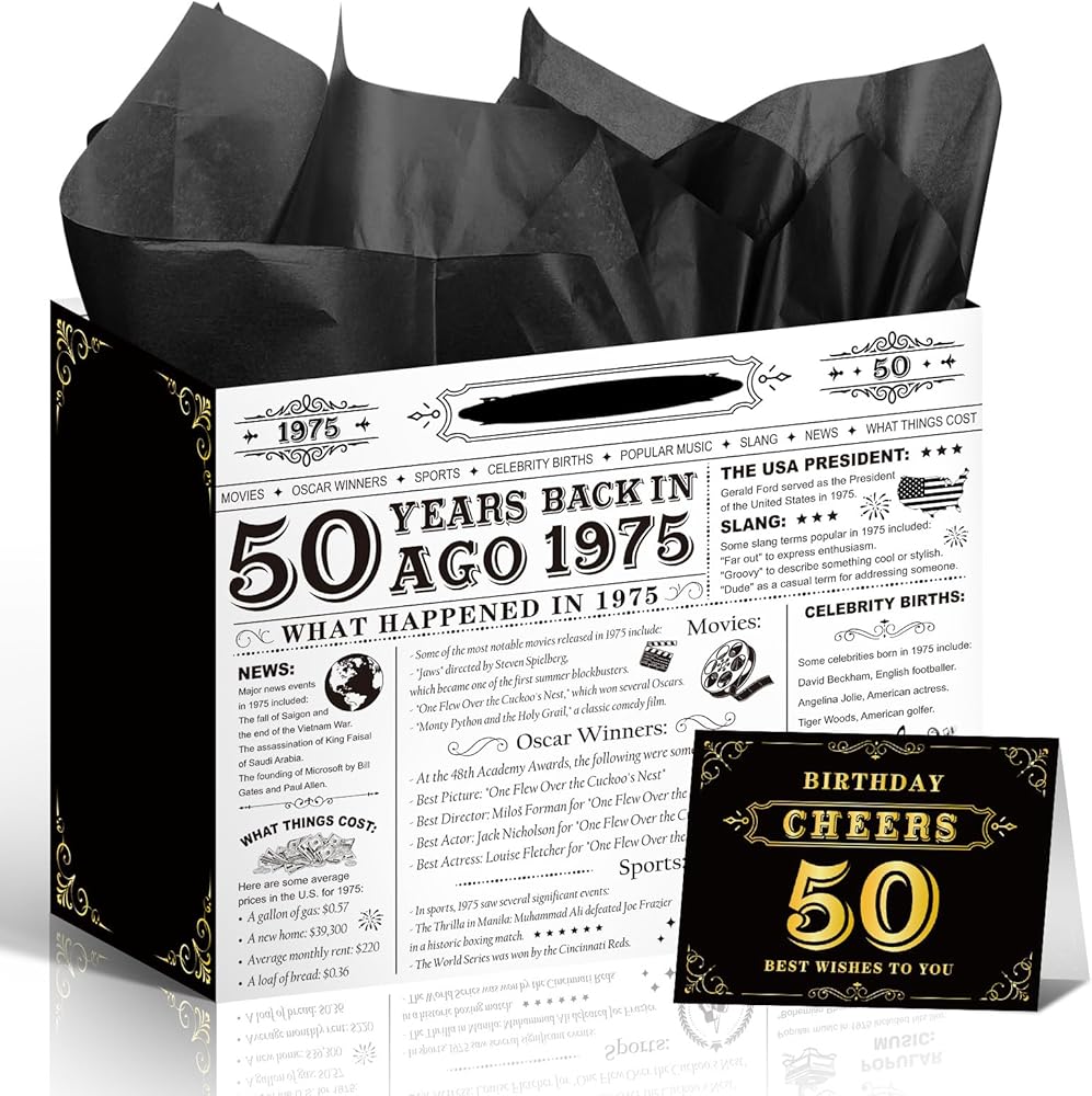 Fun Gift Wrapping: 50th gift bag is printed with some interesting things that happened in 1975 on the surface, it is the ideal wrapping solution as a gift for mother, father, husband, wife, friend, coworker, teacher, it can make your gift stand out at the birthday party