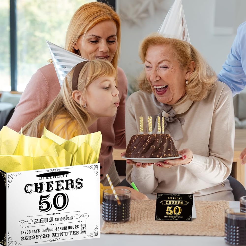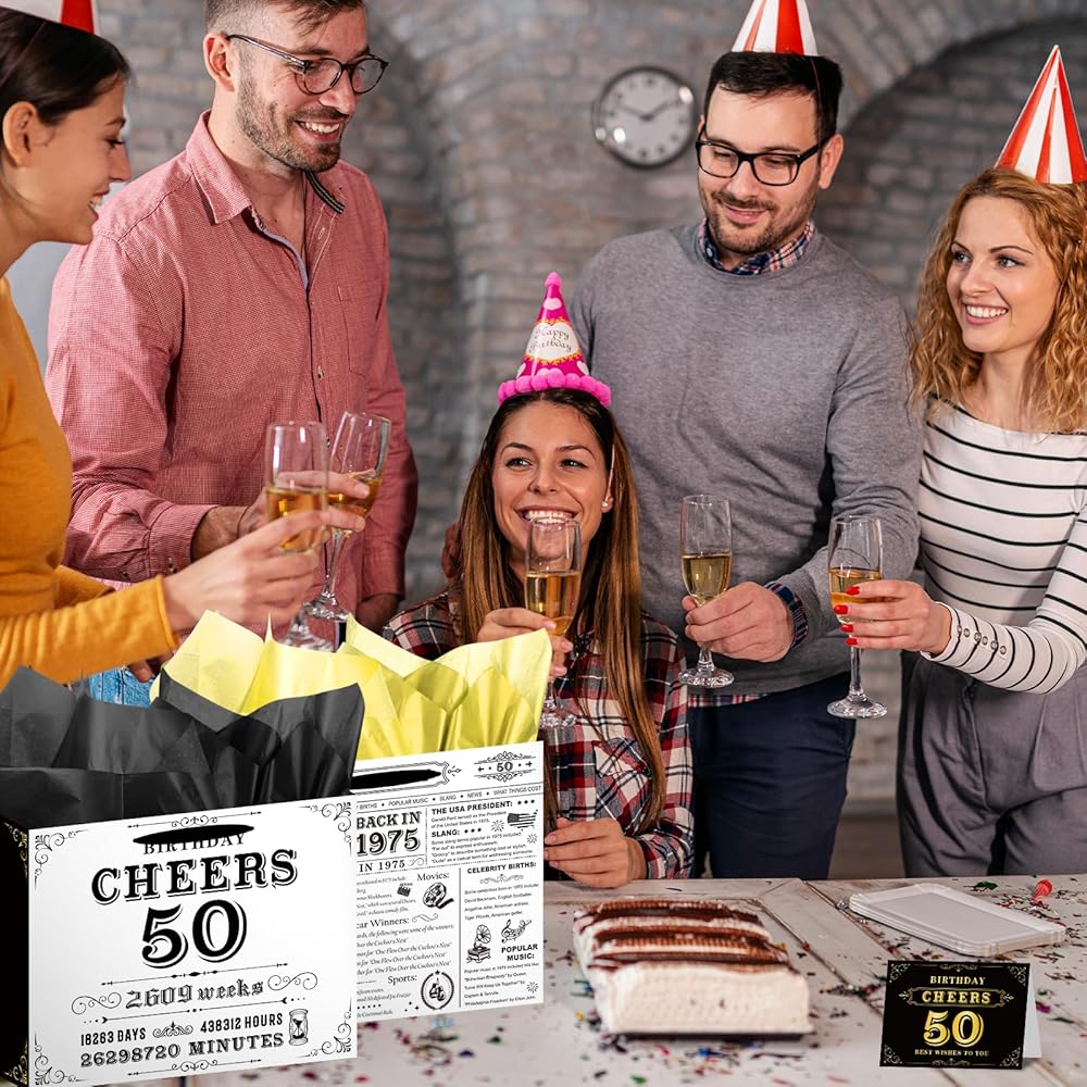 50th Birthday Gift Bag: 50th birthday gift bag set for hin and her including 1 pcs gift bag, 1 pcs greeting card and 3 pcs tissue papers; Birthday gift bag is suitable for men and women who were born in 1975 and are ready to celebrate their 50th birthday, it can make them remember this memorable day