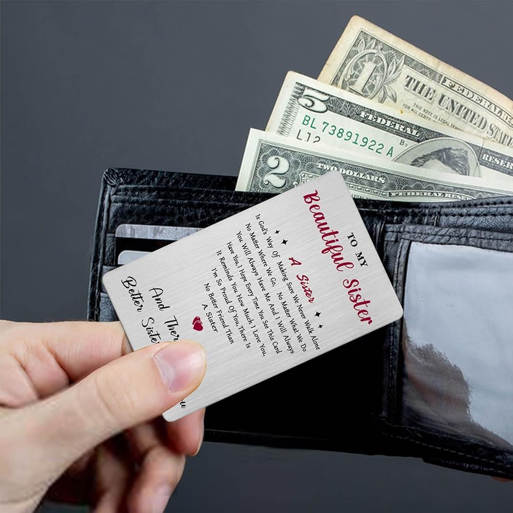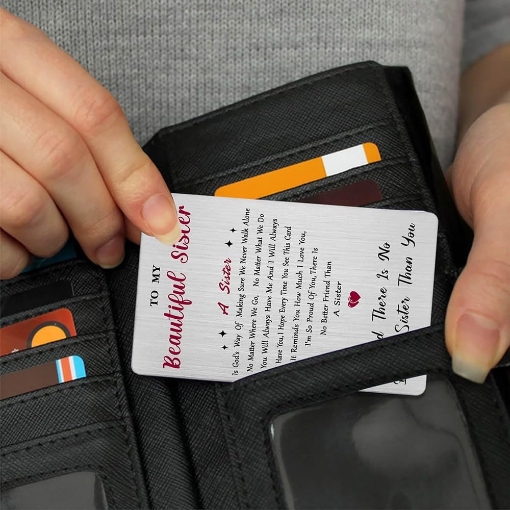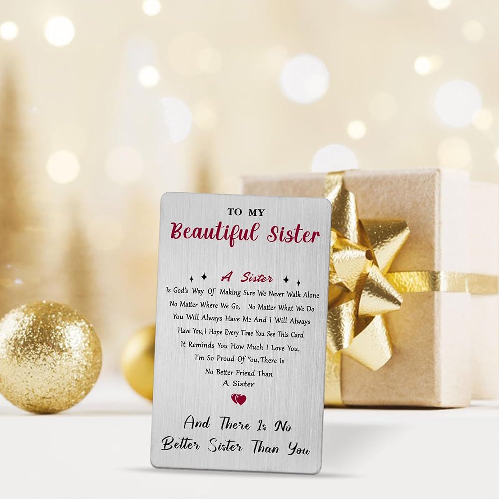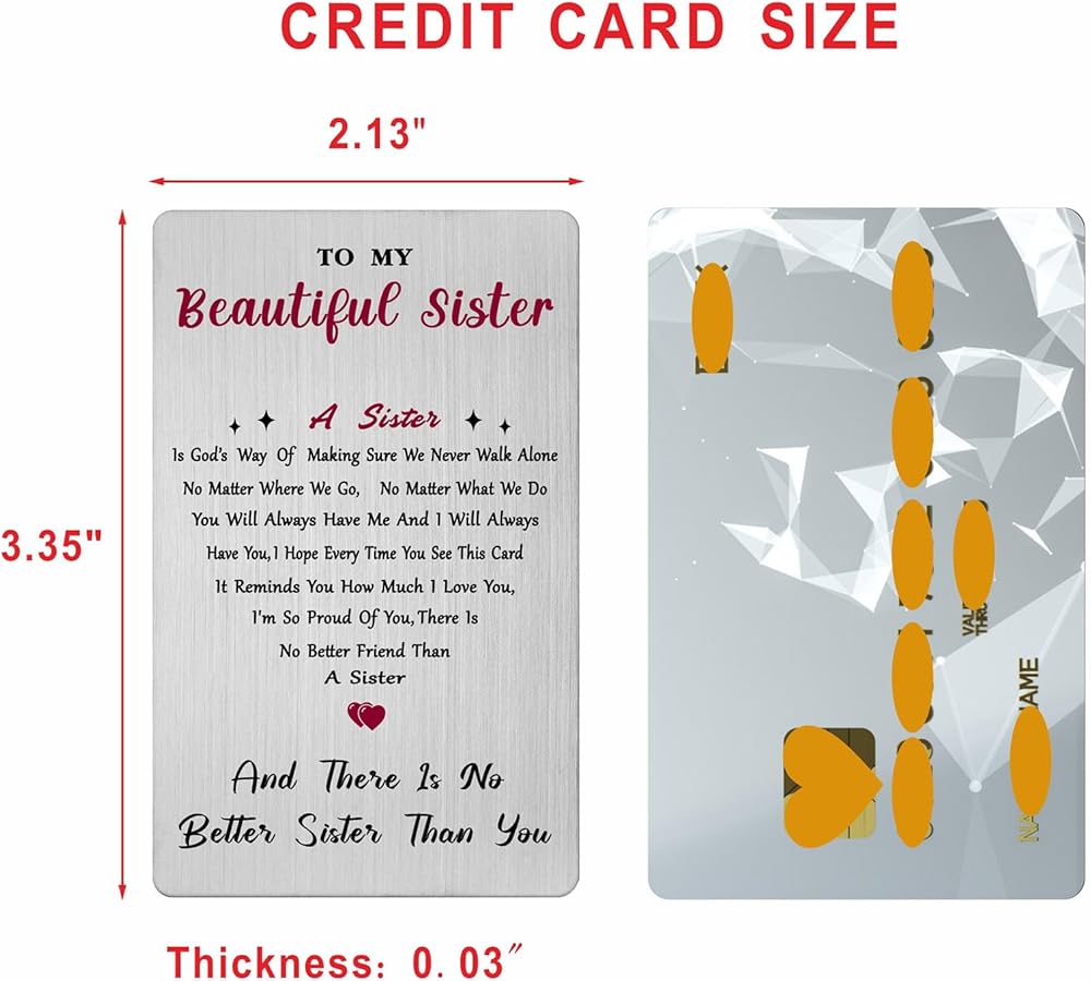 Gezxin sister mothers day insert card gifts sister giftsBest sister card gifts for birthday, mother's day, valentine's day, Christmas, Xmas, Easter, new year, wedding day, graduation, back to school, first day of school,sister christmas gifts from mum and dad personalised sister giftspersonalized sister giftshappy birthday sistersister gifts from mum from parentsxmas gifts for sisteri love my sistersister gifts from motherLaser engraved words: Front side always remember I love youBack sideto my sisterIf I could give you one thing in lifeI would give you the ability to see yourself through my eyes only then would you realize how special you are to me always keep me in your heartand remember no matter how much time passesI will love and be proud of youMaterial: Stainless SteelSize and weight:3.35*2.13" and 31gAny questions can contact us, we will help you solve the problem within 24 hours.