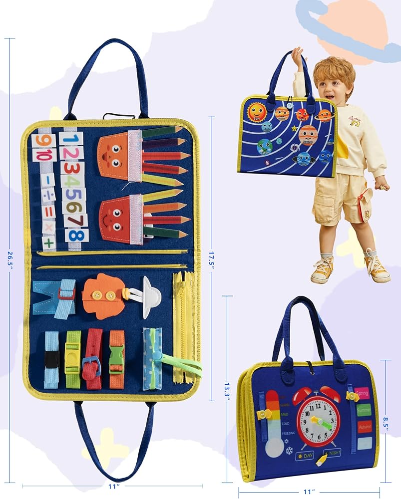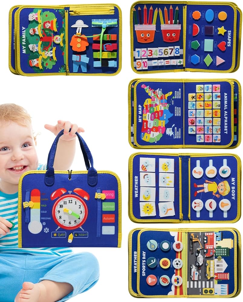【12 صفحة مشغول لوحة】: هذه اللوحة المزدحمة المكونة من 12 صفحة مليئة بأكثر من 30 نشاطًا تعليميًا متنوعًا ، مثل السوستة ، والأربطة ، والأزرار ، وتعلم الرسائل ، ومطابقة الشكل ، ومطابقة الألوان ، والحيوانات ، والألعاب الزراعية ، وألعاب الخيوط ، والمزيد.
