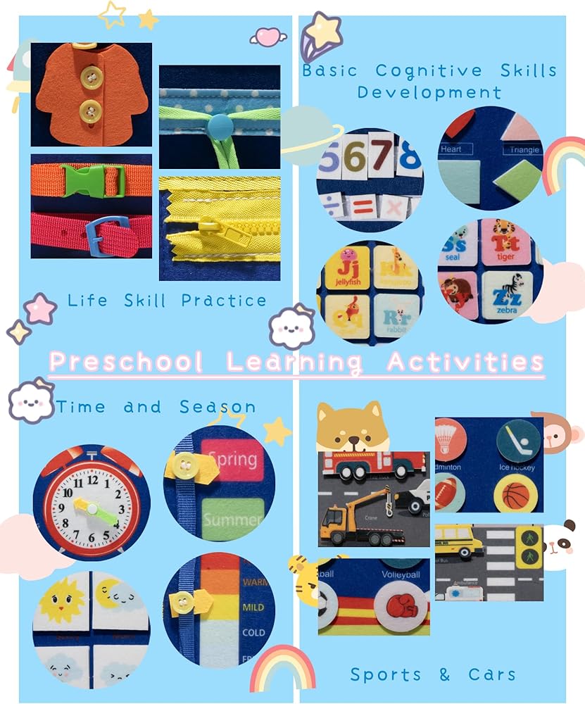 【تعزيز المهارات】: مستوحى من مبادئ مونتيسوري ، يعزز هذا المجلس المهارات الحياتية العملية ، والمهارات الحركية الدقيقة ، وحل المشكلات ، والتفكير الإبداعي ، والمهارات الحياتية الأساسية لدى الأطفال. إنه يعلمهم كيفية ارتداء الملابس ، وربط الابازيم ، والأزرار ، والعلاقات ، وبالتالي تحسين مهاراتهم الحركية الدقيقة وقدرتهم على حل المشكلات.
