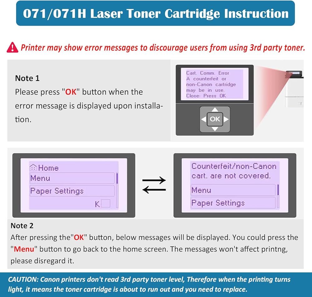 【Note】 If there is “Canon Genuine Mode” in your printer, please must close this mode, Close Canon Genuine Mode as follow step: Menue > Management Settings > Device Management > Canon Genuine Mode > Off After you close Canon Genuine mode, you install the compatible toner, there is prompt “non Canon Cartridge is possibly inserted” on printer, just press “OK” key, the toner should work.