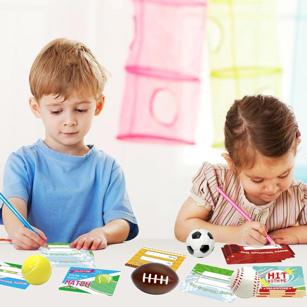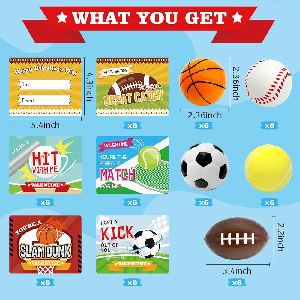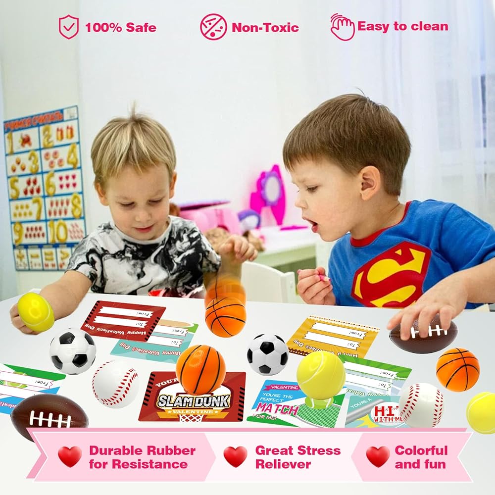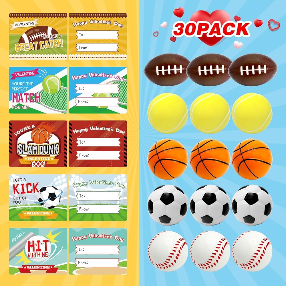 Package Includes: 30 PCS sports themed stress balls and 30 PCS Valentines exchange cards.