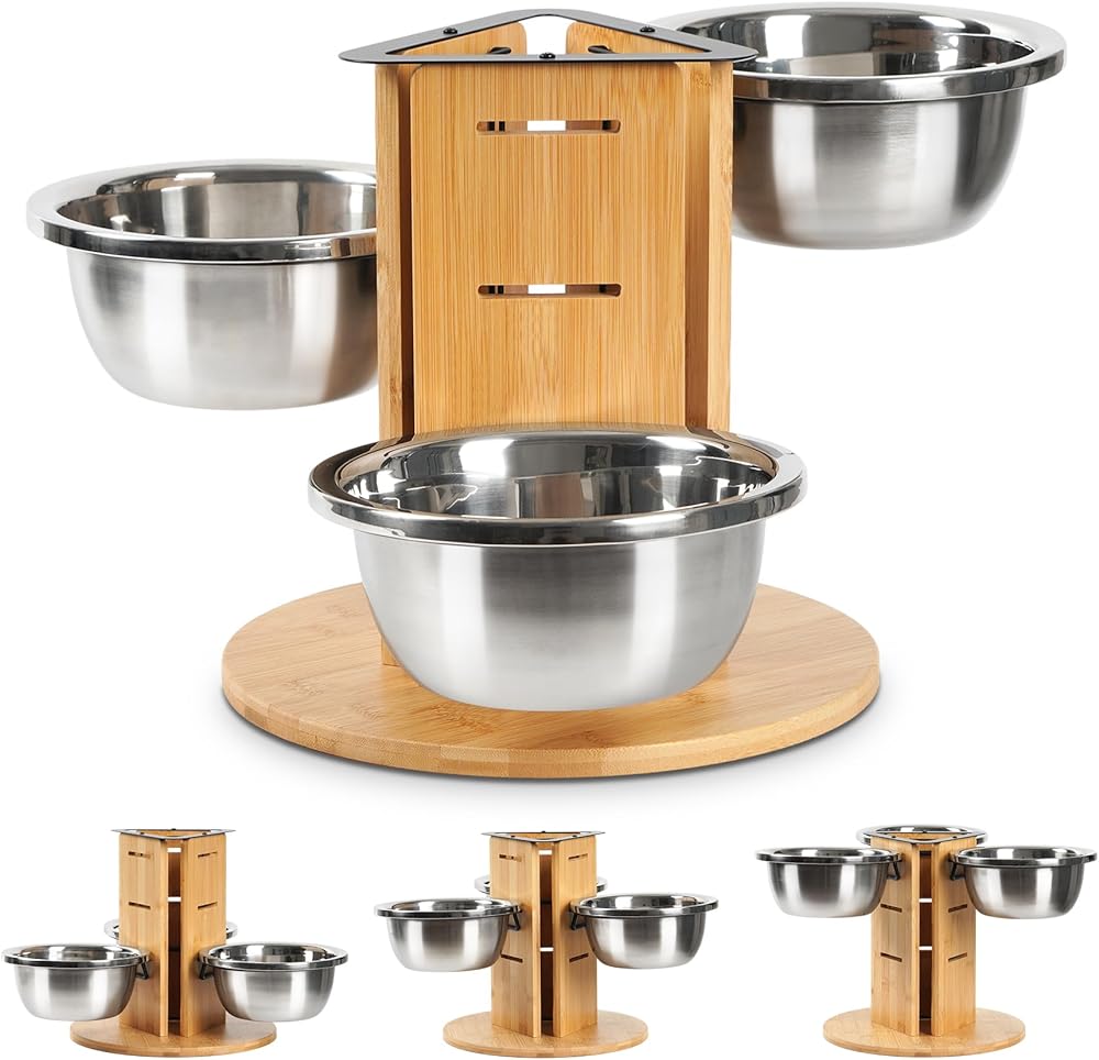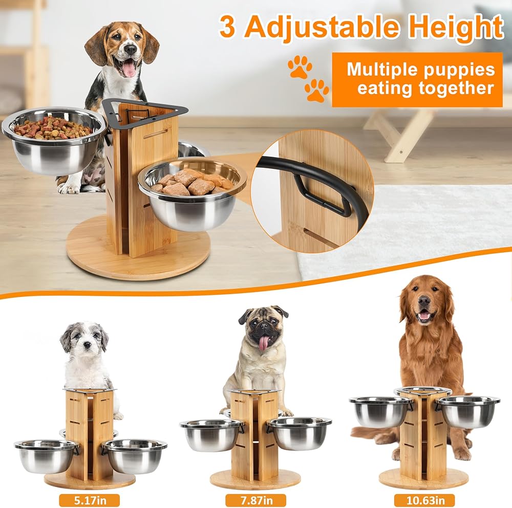 Elevated Dog Bowls, Natural Bamboo Raised Dog Bowl Stand for Medium to Large Sized Dogs 3 Adjustable Height Stand with 3 Thick 48oz Stainless Steel Bowls Non-Slip Base Pet Food Feeder
