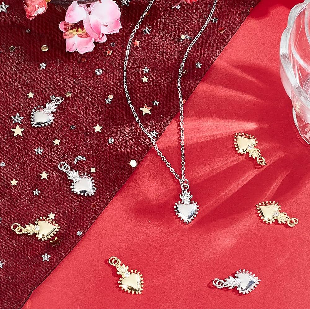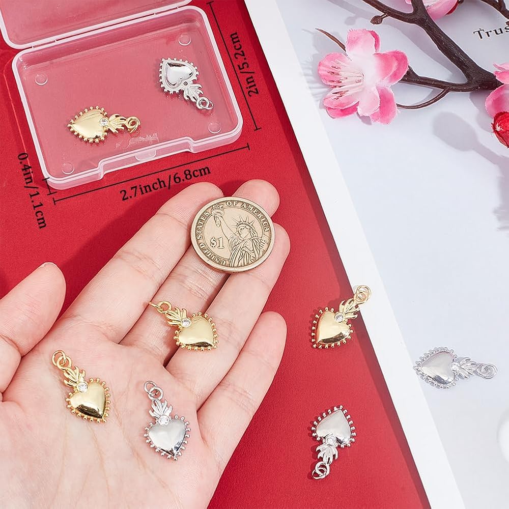 [8Pcs Charms In A Box]: 8Pcs sacred heart charms in 2 colors: gold and silver, each color 2 styles, all packaged in a small box: 6.8x5.2x1.1cm, easy to not lose the pieces, can keep chains from dirty.
