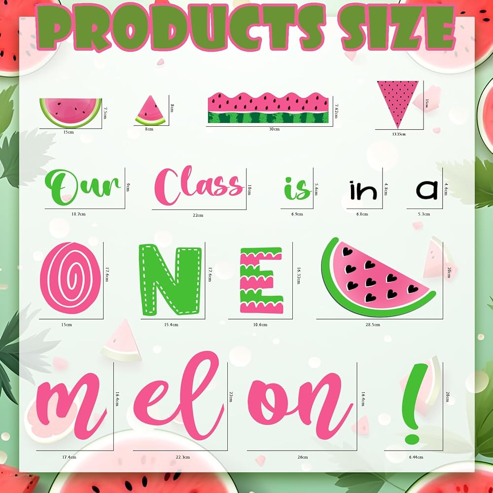🍉【Package Includes】 These watermelon decoration set include 61 pieces of summer watermelon bulletin board cutouts, 16 pieces of watermelon bulletin borders and enough adhesive dots., perfect for making it an eye-catching and lively addition to your classroom, decorating the wall or chalkboard, etc.