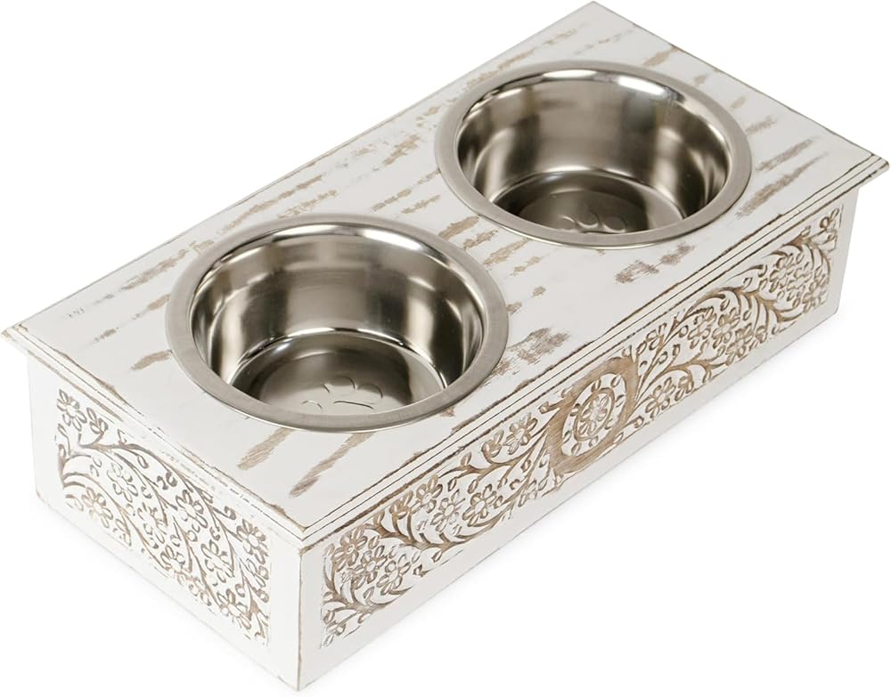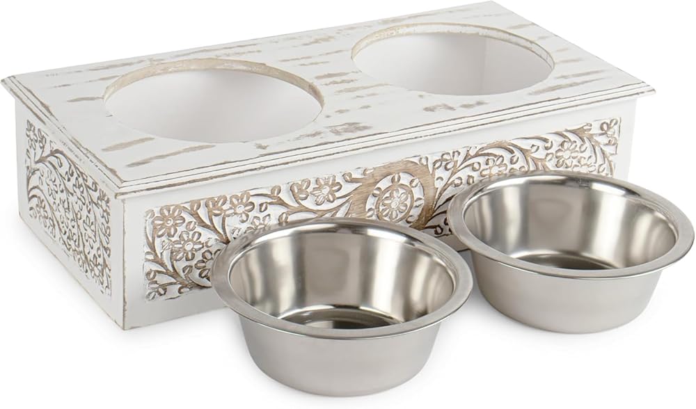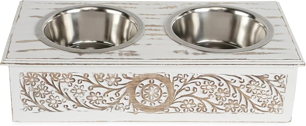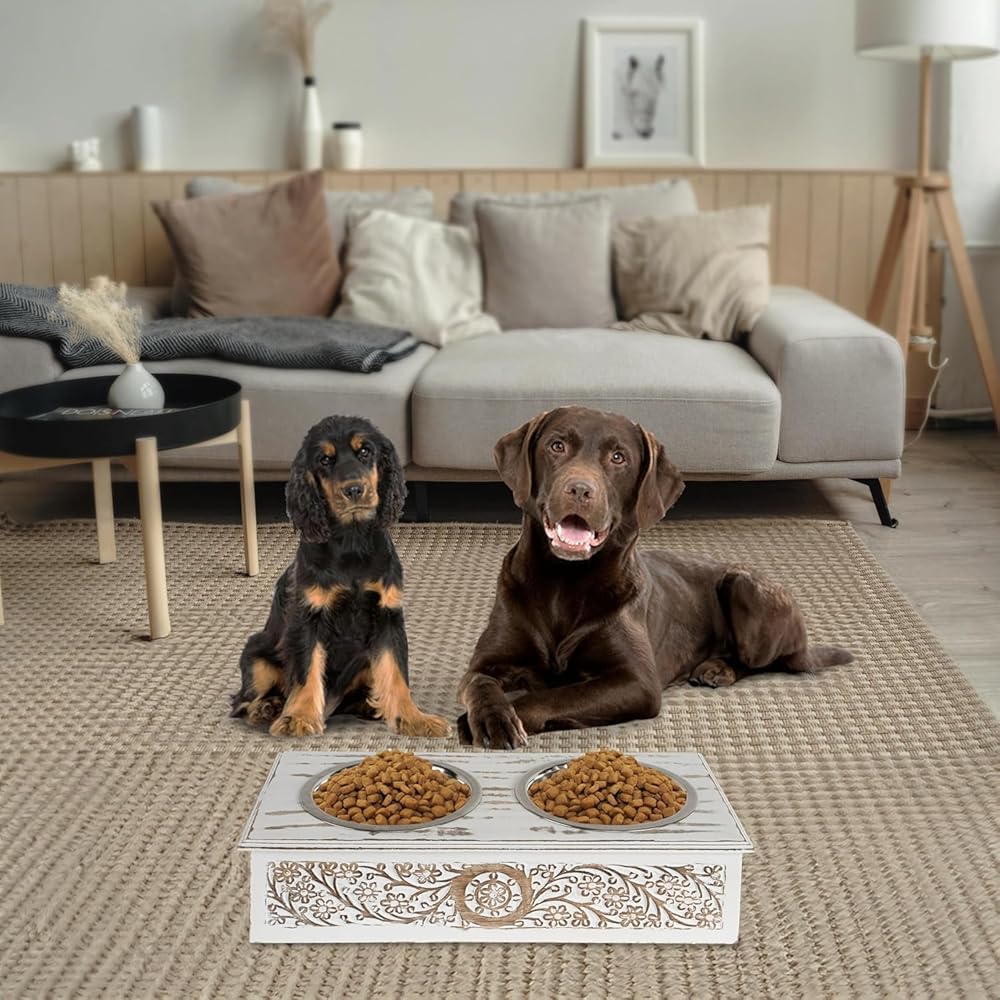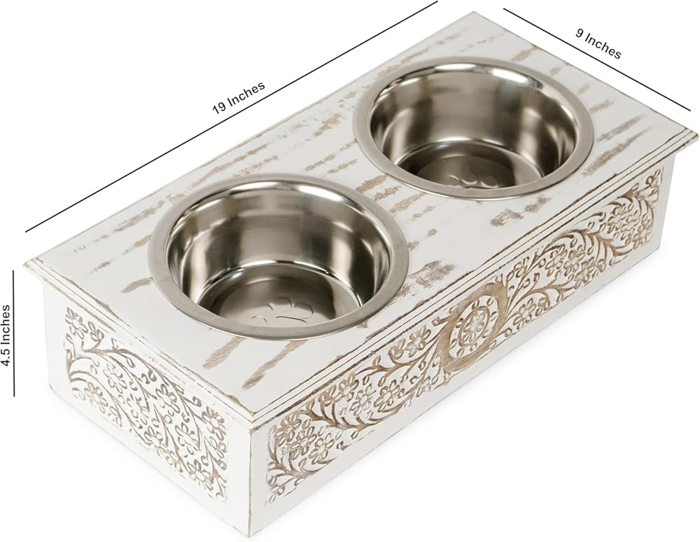 Elevated Dog & Pet Feeder Bowls With Wooden Stand (19x9x5 inch) | Elegant Hand Carved & Hand Painted Antique White Washed Wooden 2 Stainless Steel Bowls for Your Dogs & Pet’s Food & Water