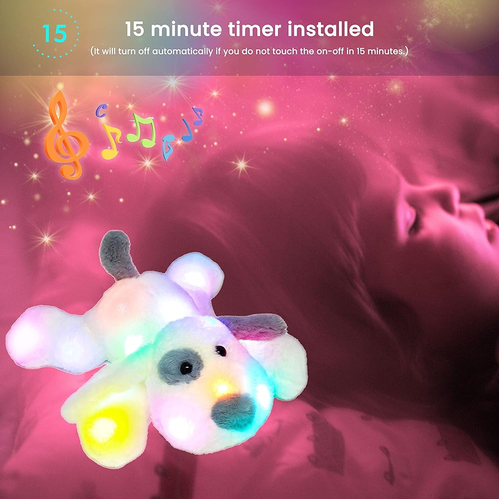 COLORFUL CHANGING LIGHTS & AUTOMATIC TURN OFF: This plush puppy features of glowing in the dark and the light will change multiple colors every few seconds. Additionally, we installed a 15 minute timer inside which will turn off automatically if you do not touch the on-off in 15 minutes. While, you can still turn it off as you like by pressing the switch again.