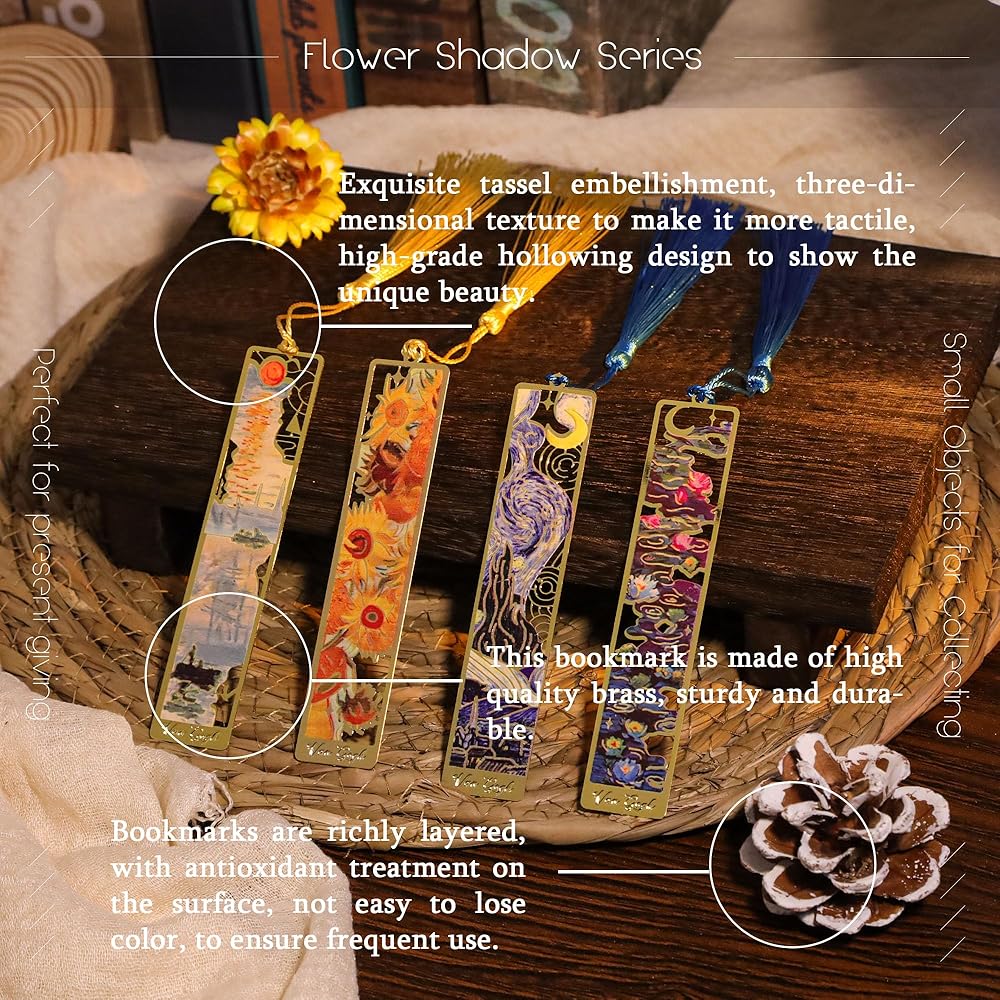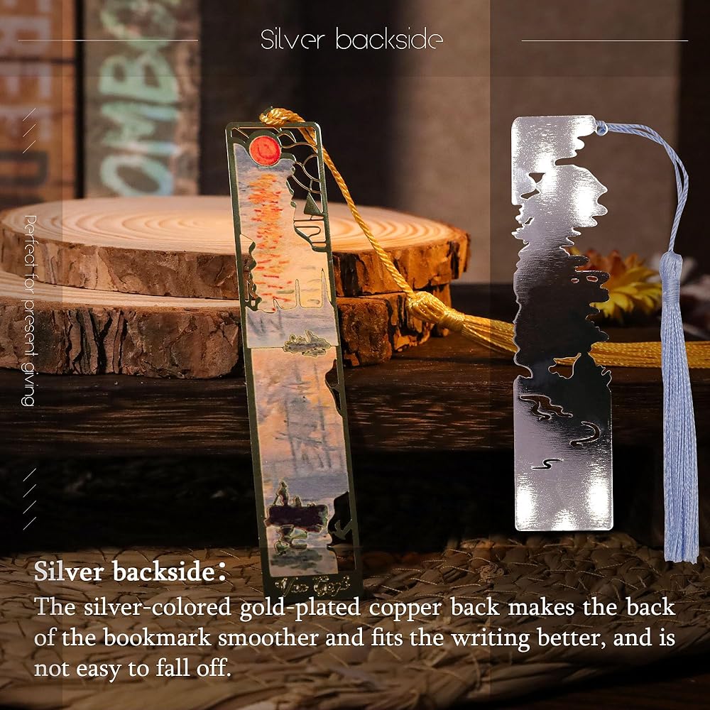 MATERIAL&CRAFTSMANSHIP: This metal bookmark is made of brass, and the three-dimensionality of the metal lines creates oil painting-like brushstrokes, giving the bookmark a unique artistic flavor. The thickening treatment not only enhances the durability of the bookmark, but also allows its luster and texture to remain intact over time
