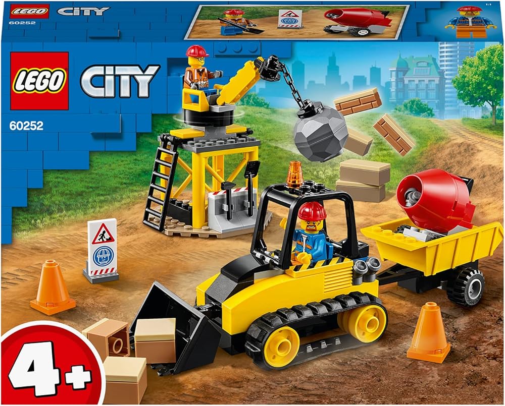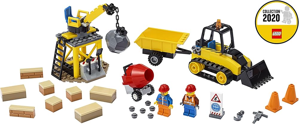 Includes 2 worker minifigures and accessories: road signs and cones, a pneumatic drill, hammer and shovel, cement bricks and a hook to lift