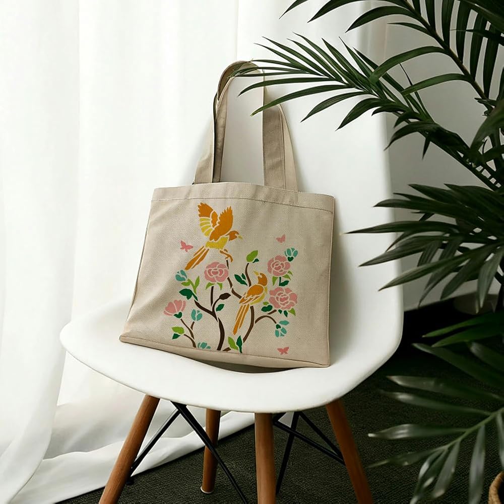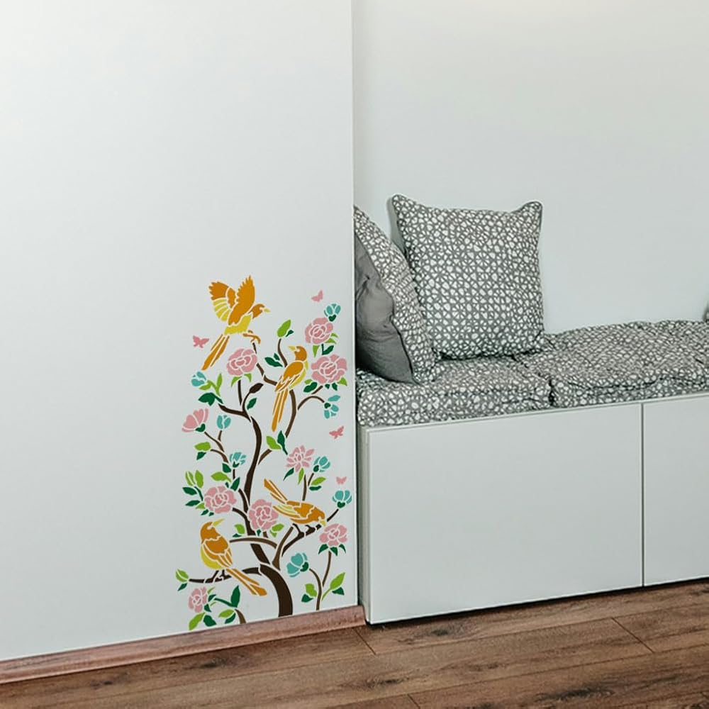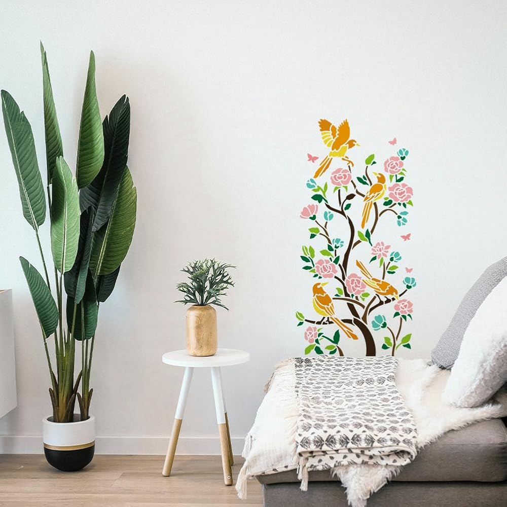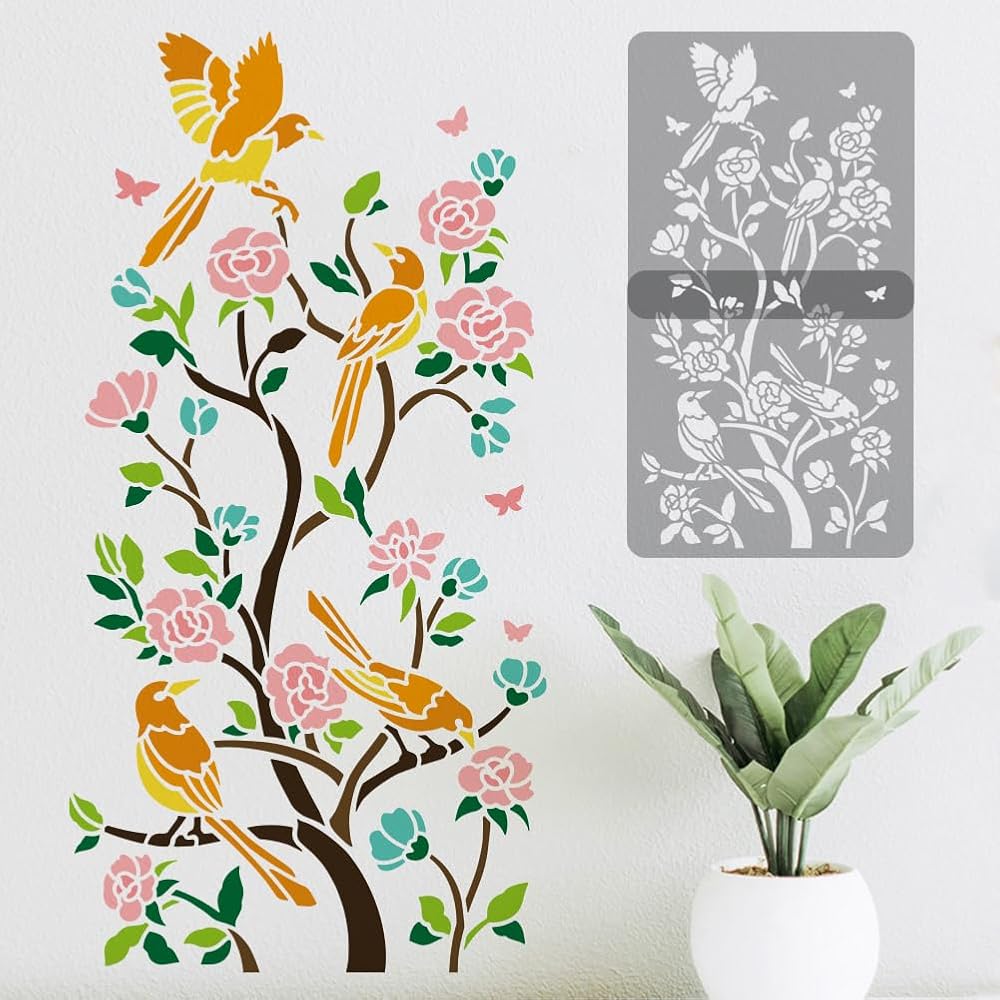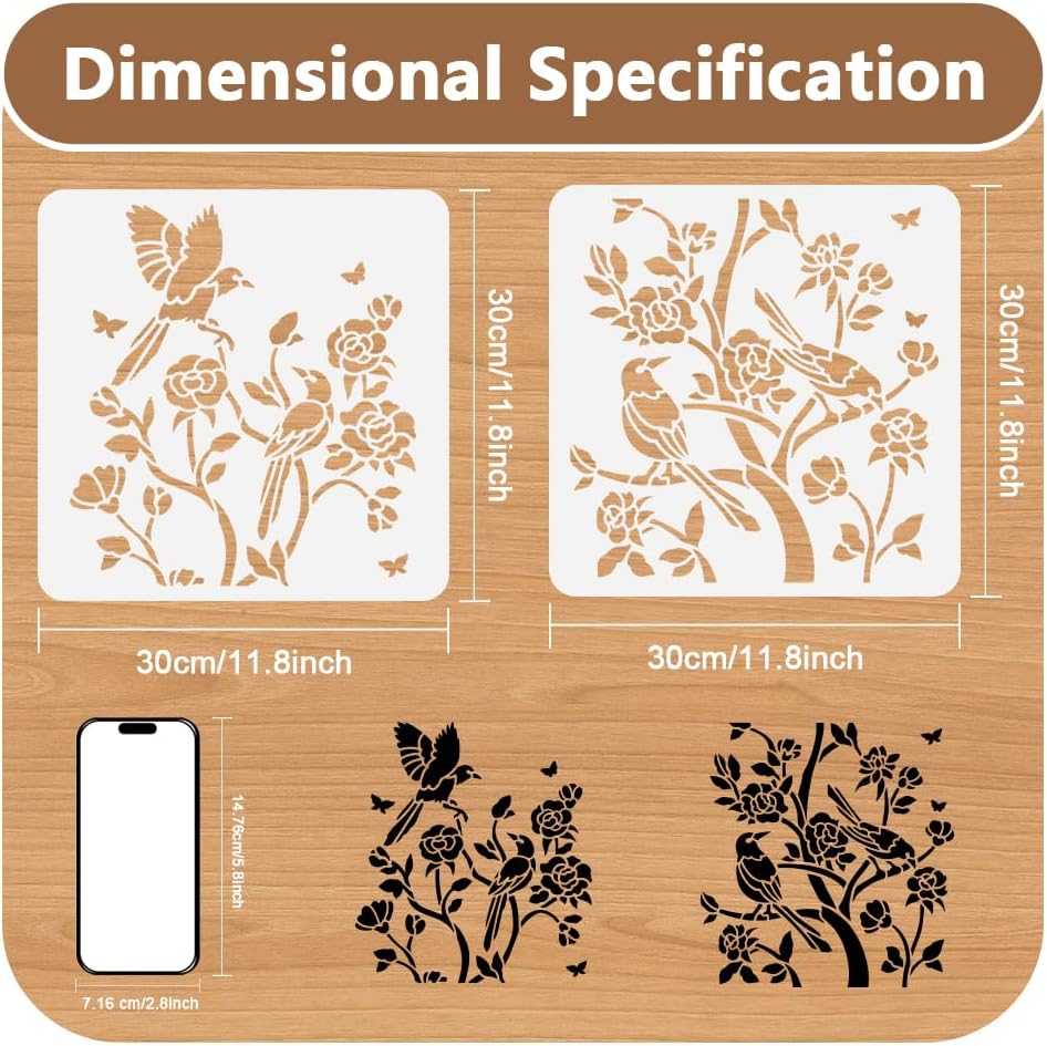 Portable Size: Including 2pcs birds on flower branch wall stencils measuring 11.8x 11.8 inch, convenient for daily use, can be used with sponge brushes, painting brushes, acrylic paints or spray with a spray can to create an unique artwork