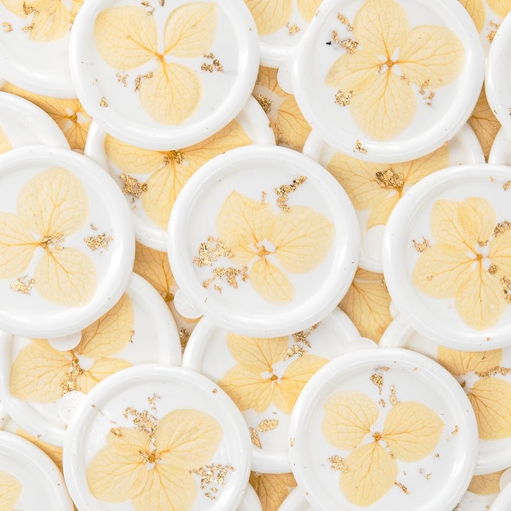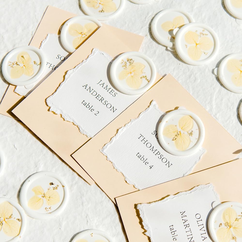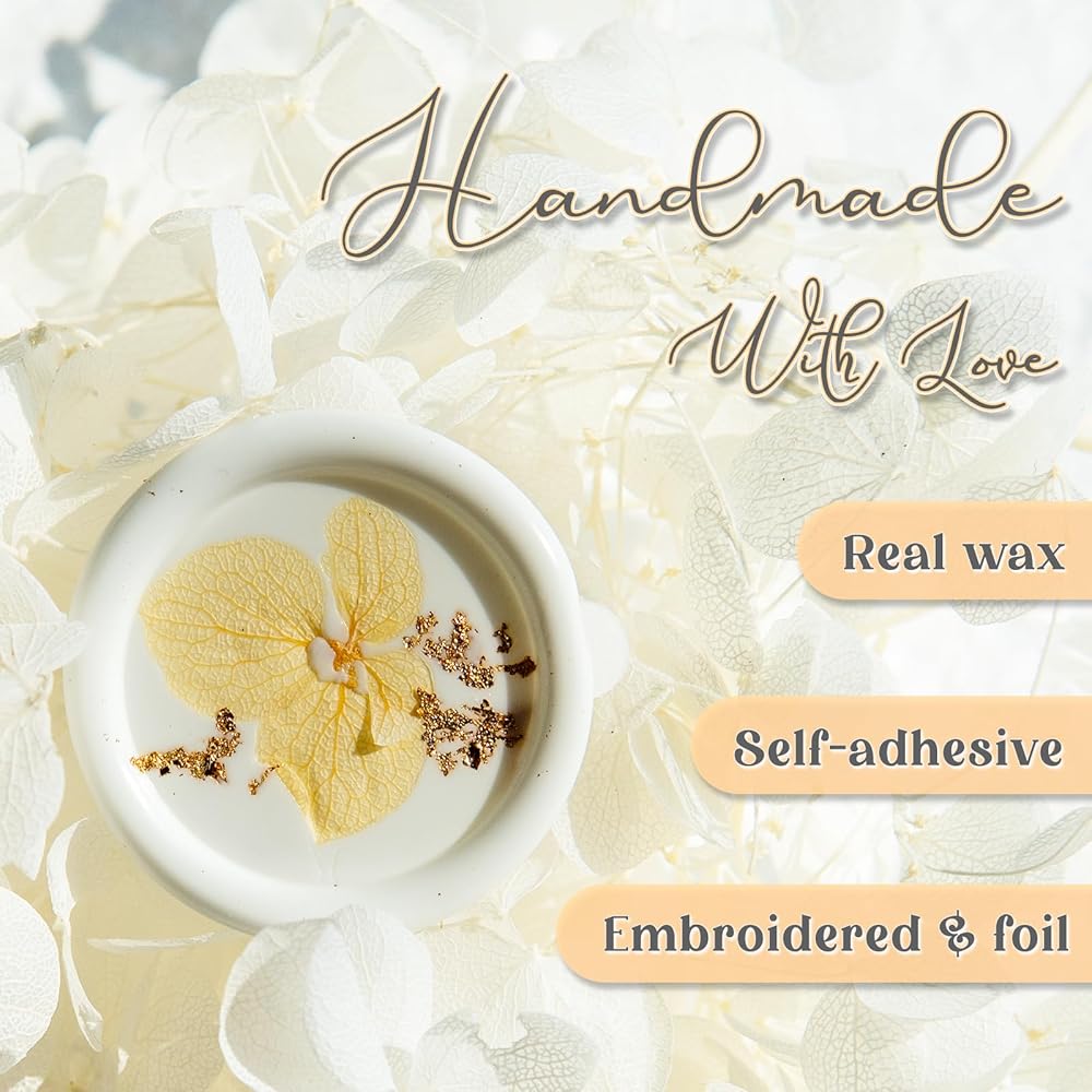 ELEGANT WHITE DESIGN: Featuring a timeless embossed finish with hydrangea dried flowers and gold foil accents, these white wax seal stickers add sophistication and charm to any occasion