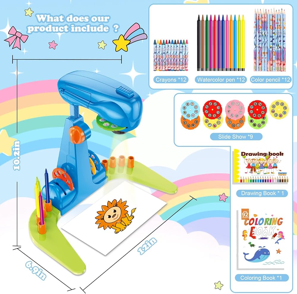Sumsoltic Drawing Projector for Kids, Art and Craft Kit, Including Colored Pencils, Crayons, Coloring Books, Toys for 3+ Year Old Boys (Blue Drawing Kit v1)