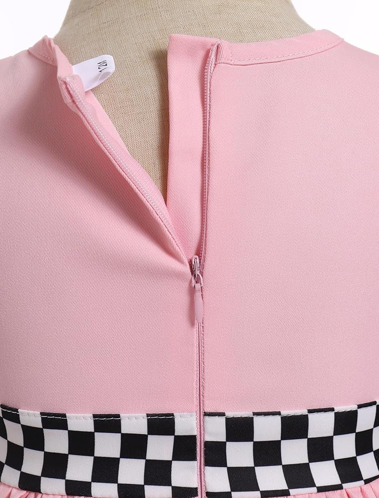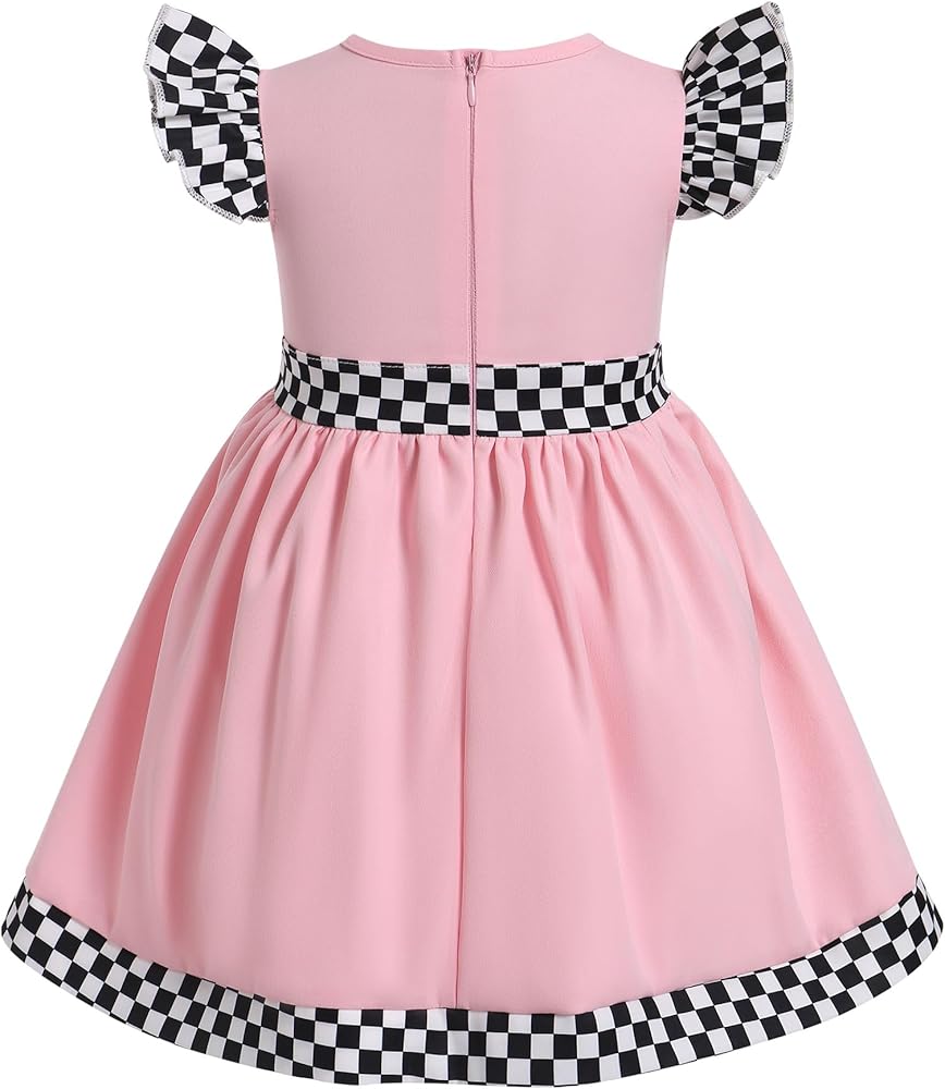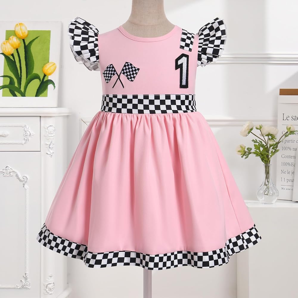 Race Car Birthday Dress Design: Flutter ruffle sleeve round neck race car dress, embroidered checkered racing flag accents at the left, the number "1" or "2" at front, black and white checkered detail at waistline and hemline, adds a striking touch to the racing costume. Hidden zipper at back, zip garage between the zipper and the body, prevent chafing and reduce discomfort caused by the frigid zip. Adorable as race car outfit 1 year old, race car outfit for toddler girls 2t;
