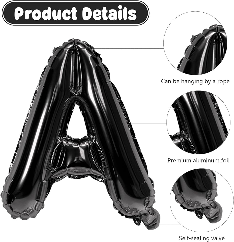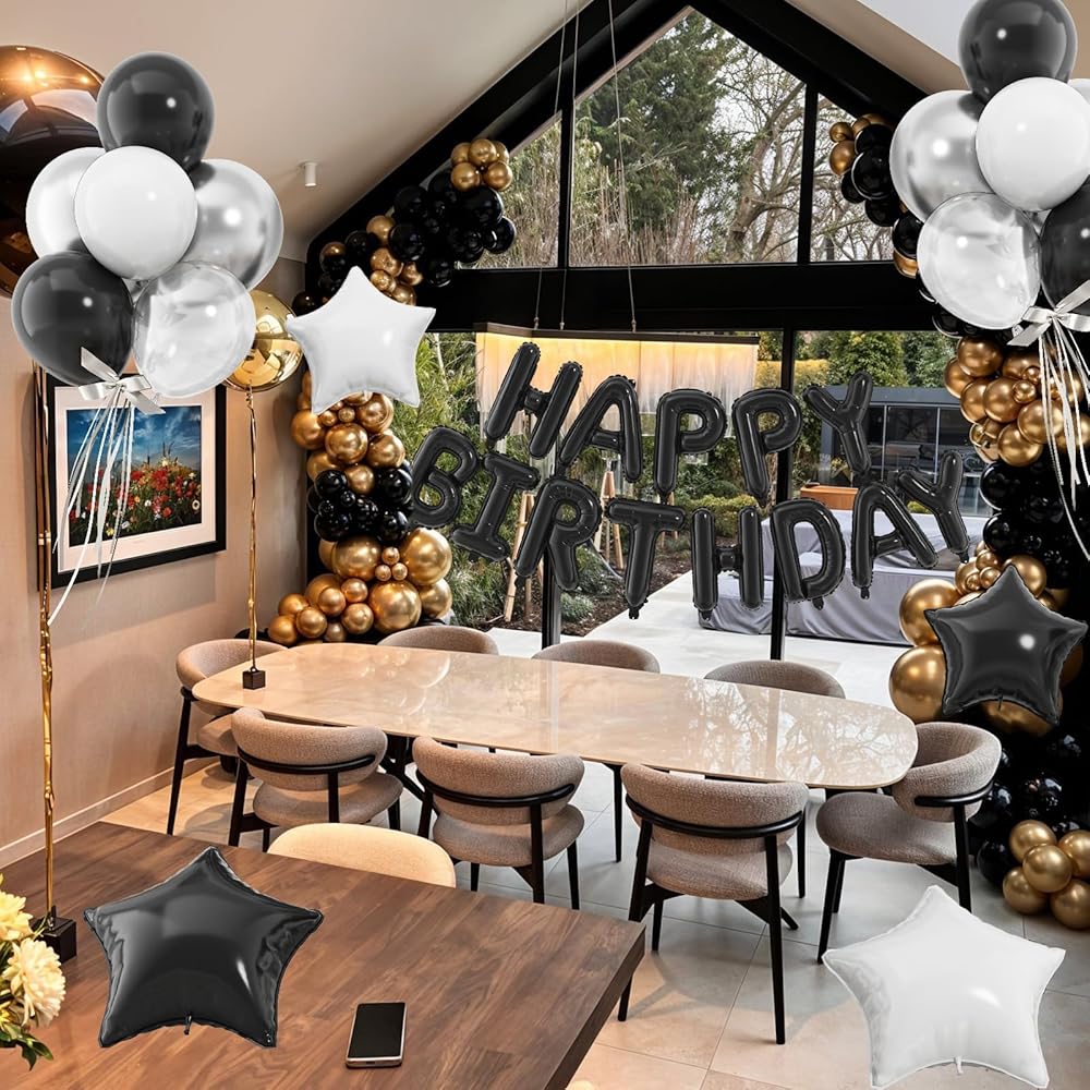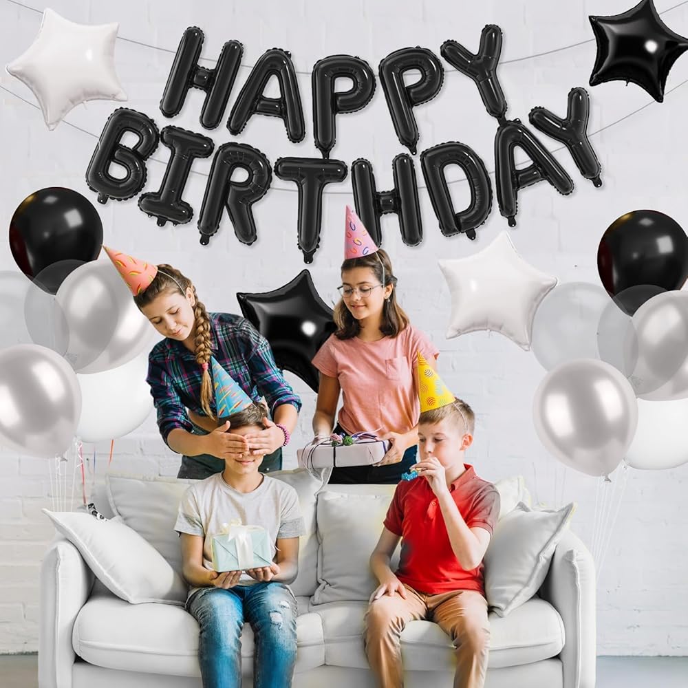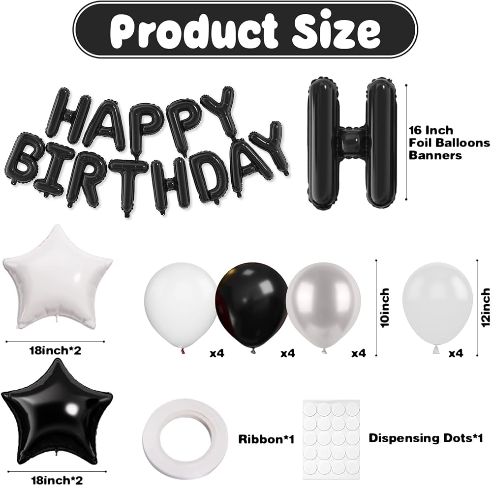 29PC Black Happy Birthday Balloon Banner, 16 Inch 3D Aluminum Letter Banner Sign, Metallic Silver Black White Clear Helium Balloons 18 Inch Star Foil Balloons for Women, Men Party Supply