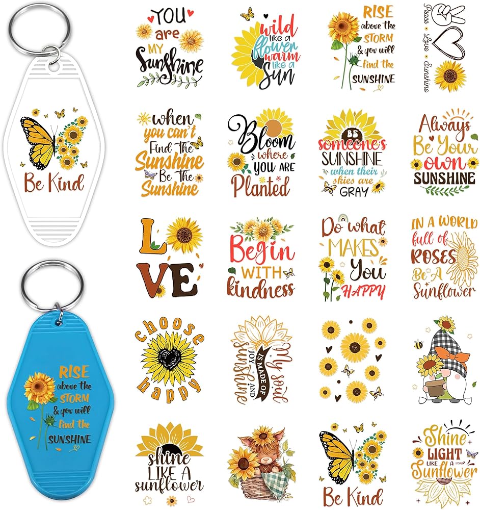 Unique Design: Our keychain transfer stickers have sunflowers, highland cows, letters, and inspirational quotes such as "sun like a sunflower" "you are my sunshine" "LOVE" "choose happy" "be kind" "begin with kindness" "do what make you happy""always be your own sunshine", butterflies, sun, gestures, love, plants and other patterns