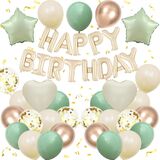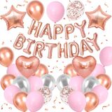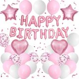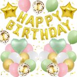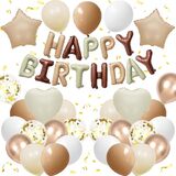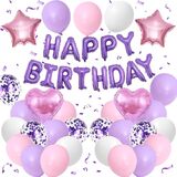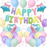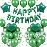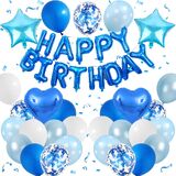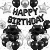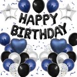 BLUE AND BLACK BIRTHDAY DECORATIONS:The package contains 8 x navy blue balloons(12inch), 8 x black balloons(12inch), 4 x silver confetti balloons(12inch),4 x metallic silver balloons(12inch),16inch black foil “Happy Birthday” balloon banner, 2 navy blue heart shaped foil balloons, 2 silver star shaped foil balloons, plus glue dot sheet and ribbon for easy assembly.