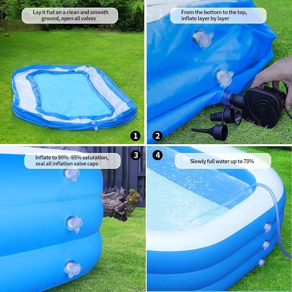 🤩【Quick & Easy Setup】: Our family inflatable pool is incredibly easy to set up! Just spread it out on level ground and inflate it with an electric pump (not included) in just 3-4 minutes. Plus, our built-in 2 curve water valves double the drainage speed for easy cleanup.