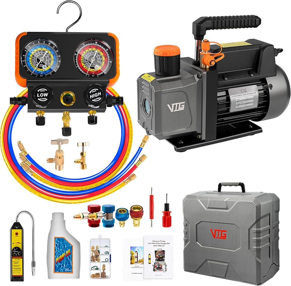 HVAC Vacuum Pump Kit: This ac vacuum pump and gauge set includes a 1/3 HP 4.5 CFM Single Stage vacuum pump, a 3-way manifold gauge, 3 hoses,2 core depressor valves,a low-pressure quick coupler, a high-pressure quick coupler,a leak detector, a 1/4" male to 1/2" female adapter,3pcs R410a adapters (two 45-degree R410A adapters and one straight R410A adapter,from1/4'' male to 5/16'' female),a bottle of vacuum pump oil,a R134a puncture style can tap,a thickened and durable trifold storage case,a user manual,and other tools like valve core wrench and screwdriver;the vacuum pump,gauge and all other accessories neatly packed in the storage case for easy carry