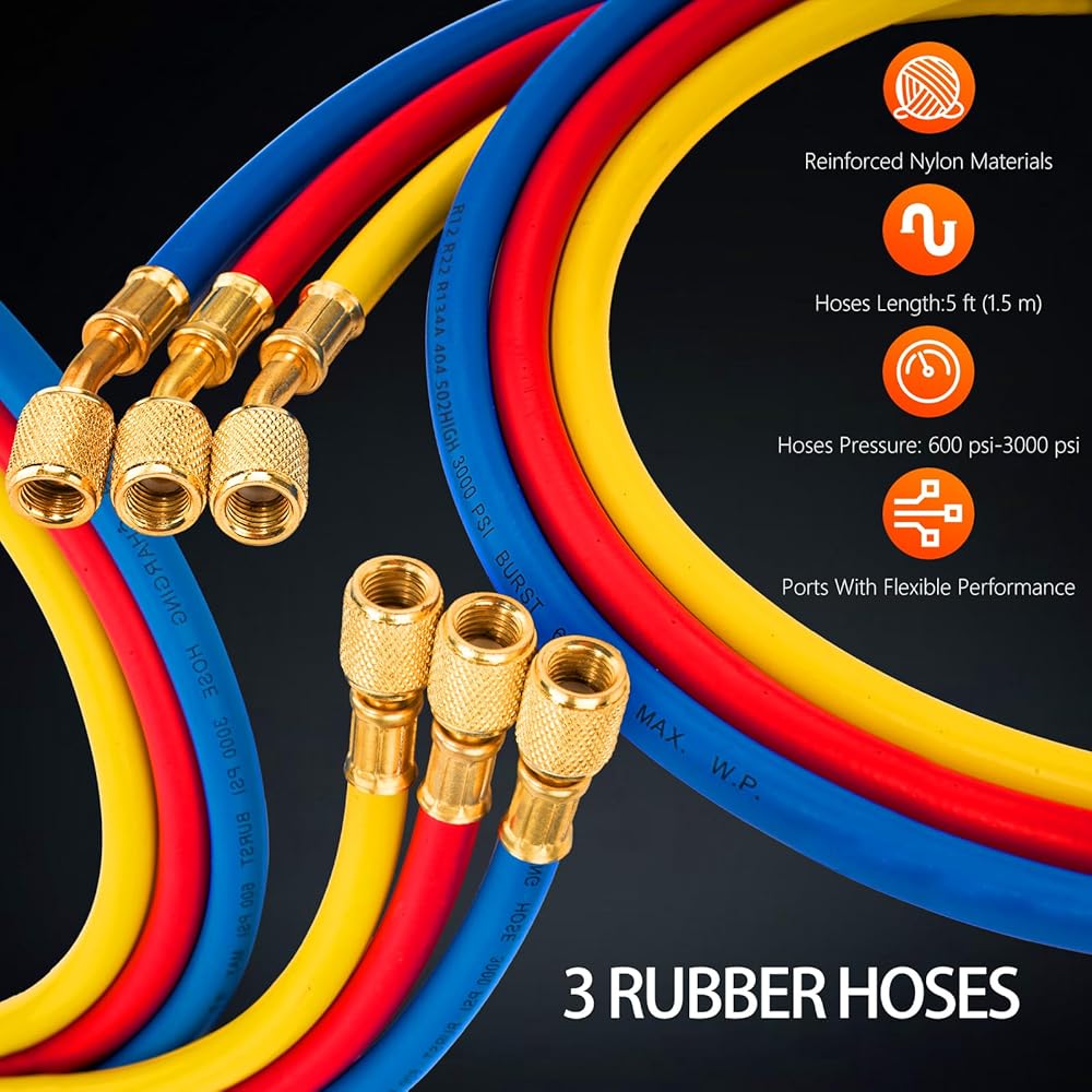 Rubber Hoses:The four 5 ft long color-coded rubber hoses (red for high-pressure, blue for low-pressure, yellow for filling) are flexible and durable, designed to withstand long-term use with a working pressure of 800 psi and burst pressure of 4000 psi