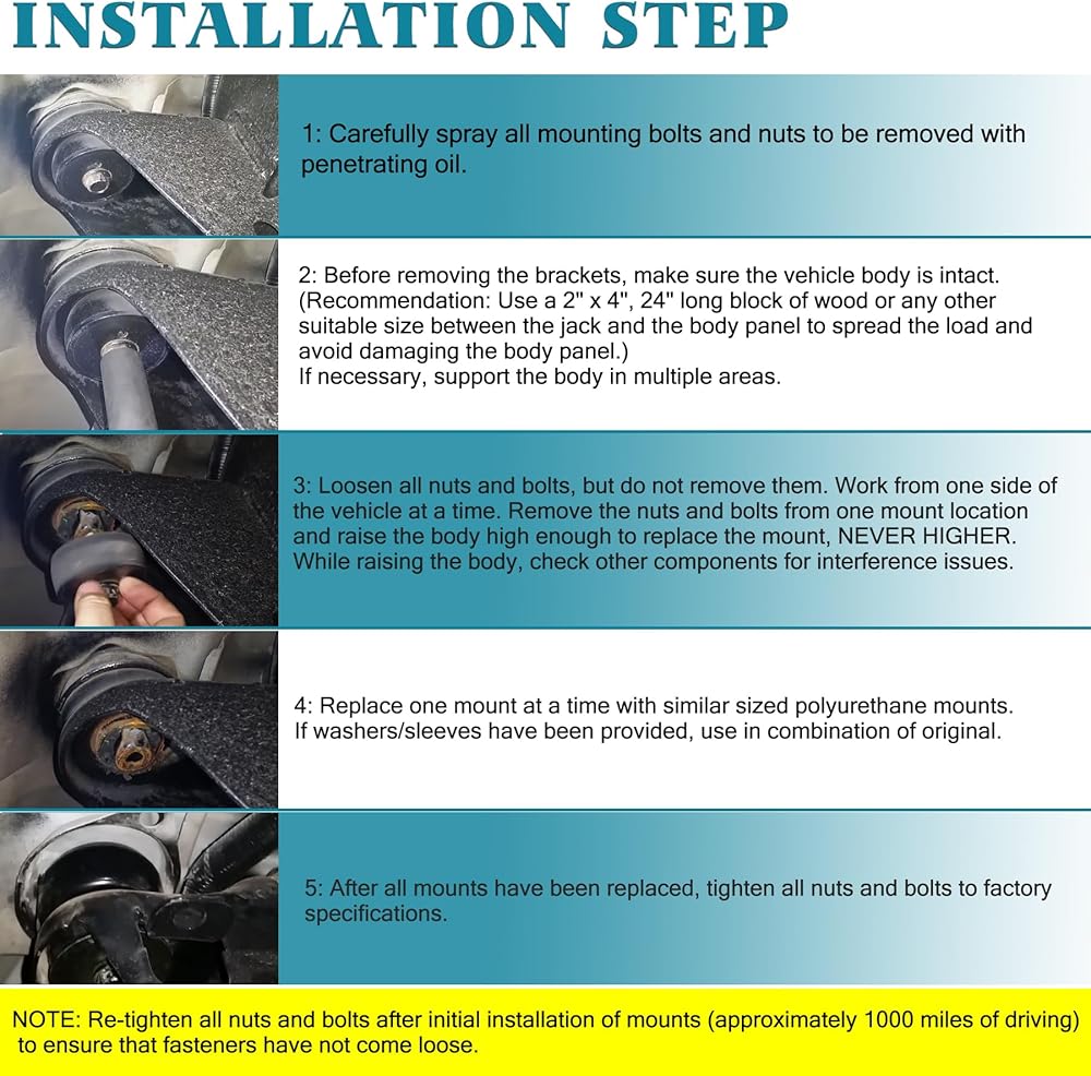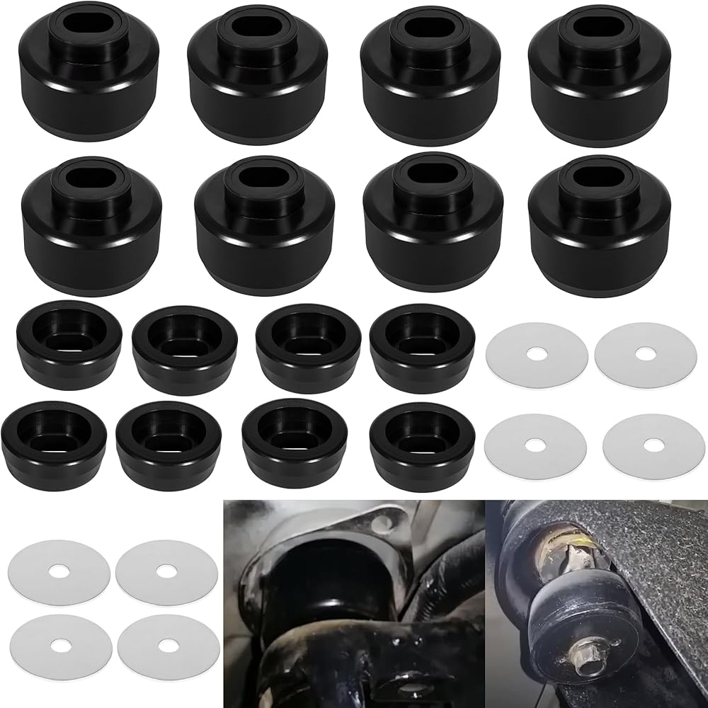 FEATURES: Replace the worn out body mount bushings, can fix the body mounts problems, also can resist vehicle fluids and road grime, to reduce equipment wear, vibration and noise. Improving performance and handling, very suitable for off-road and street use.