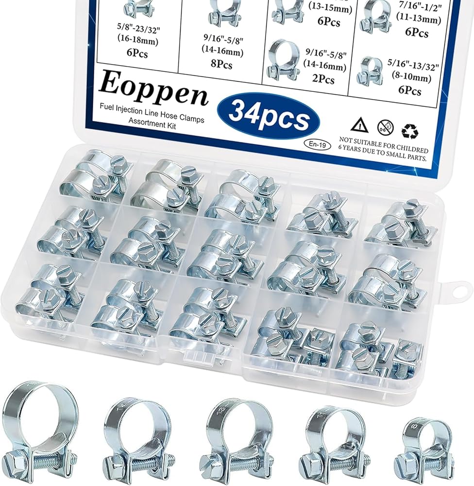 Hose Clamp Size: 34Pcs 5 different sizes of hose clamps, 5/16 inch-13/32 inch, 7/16 inch-1/2 inch, 1/2 inch-9/16 inch, 9/16 inch-5/8 inch, 5/8 inch-23/32 inch ,Packed in a sturdy box, not easy to be damaged, easy to store and carry