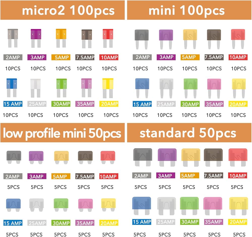 100PCS MICRO2 FUSE KIT– This set includes 100 Micro 2 fuses in 10 different amperage ratings: 2A, 3A, 5A, 7.5A, 10A, 15A, 20A, 25A, 30A, and 35A (10 pieces of each). Perfect for automotive and electronic applications.