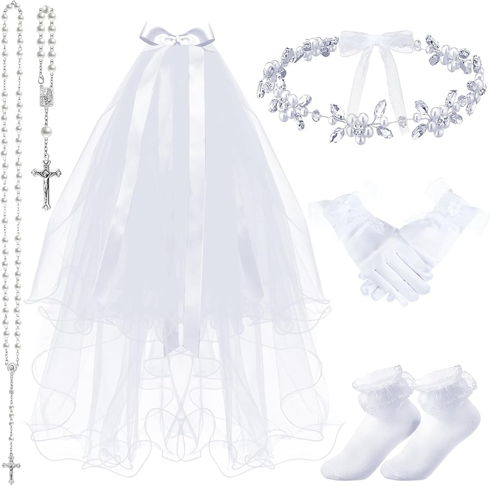 First Communion Set: You will receive 1 girl's First Communion veil, 1 pair of white satin gloves, 1 rosary bracelet, 1 rosary necklace, 1 floral rhinestone hair band and 1 pair of white lace stockings, this is a great combo set, whether you pair it up with something else or with something else, you can dress up as a princess and show off your elegance and charm