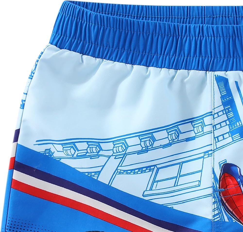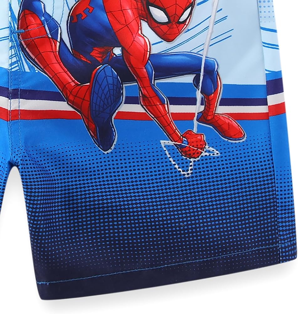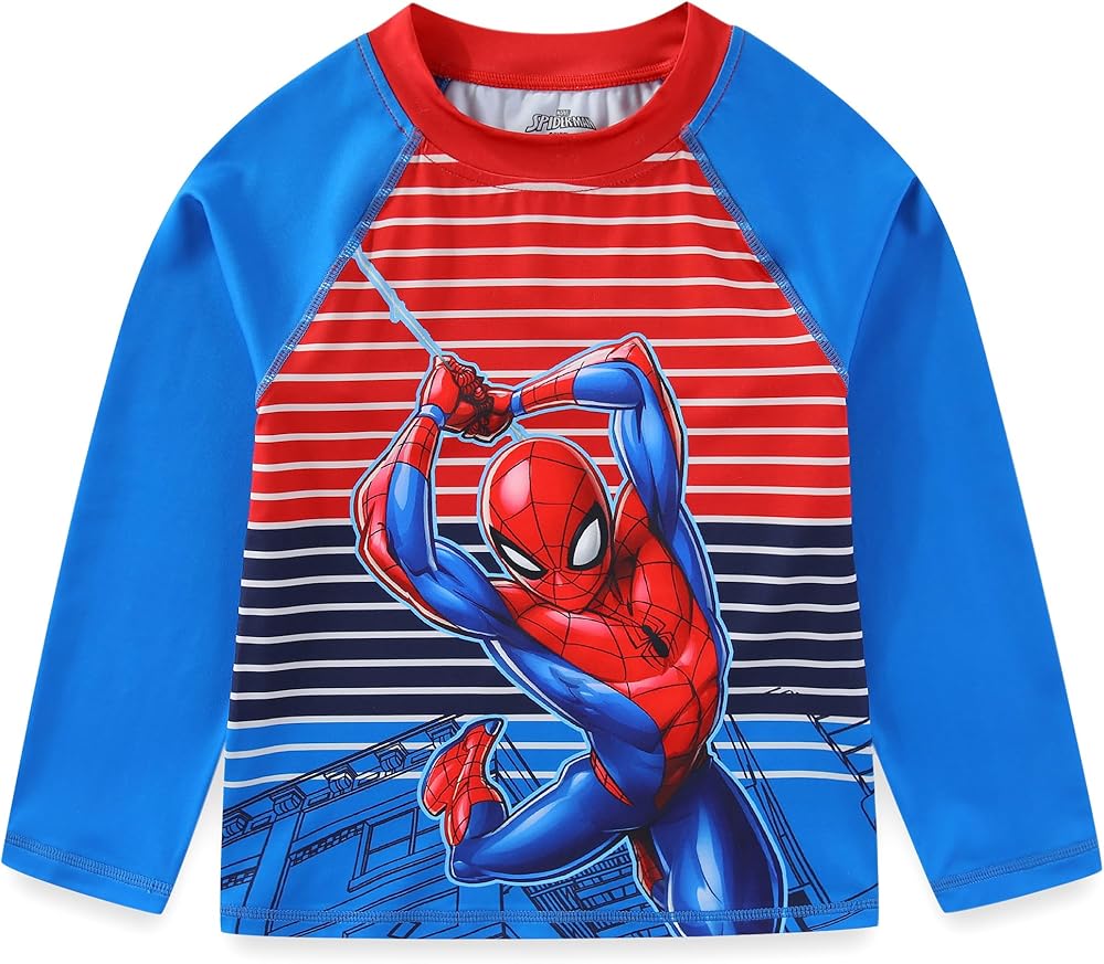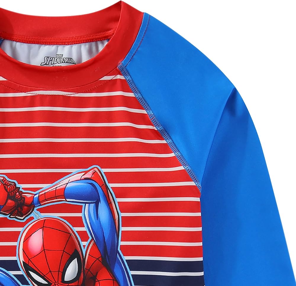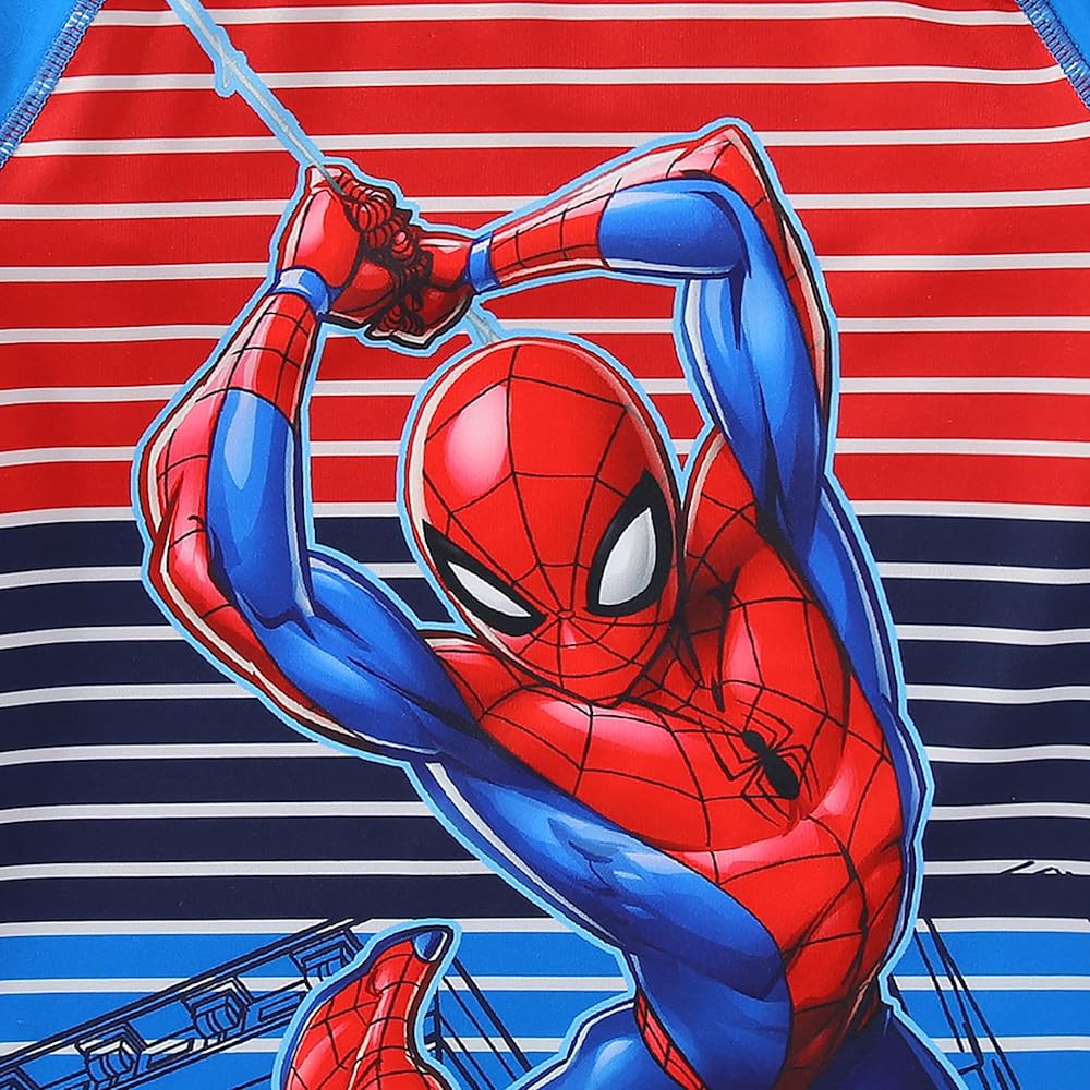 Contains a blue rash guard with Spider-Man in action print, paired with a matching blue swim trunks with the same action print of the beloved hero, inspiring endless fun at the beach, pool, or any swimming adventures.