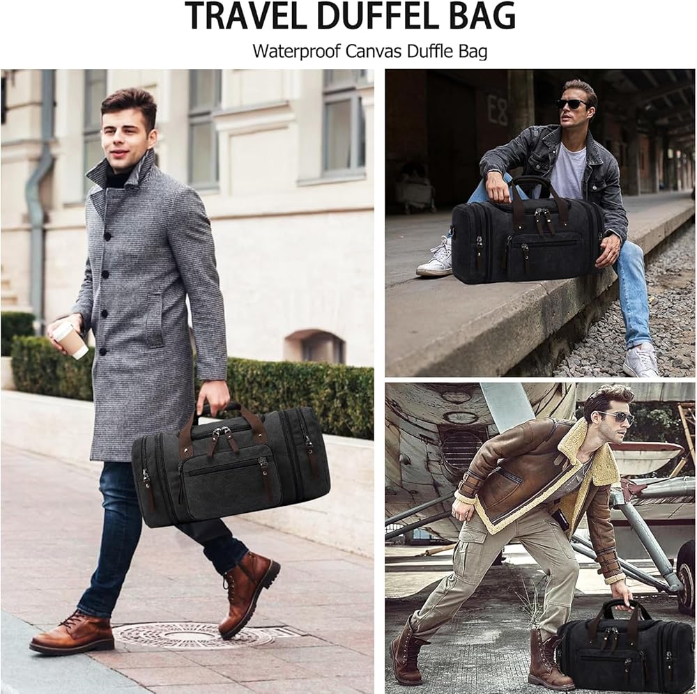 Felipe Varela Duffle Bag for Men, Canvas Expandable Duffel Bag for Travel, Mens Carry On Luggage Bags Traveling Weekender Gym Overnight Duffel Bags for Airplanes, Black