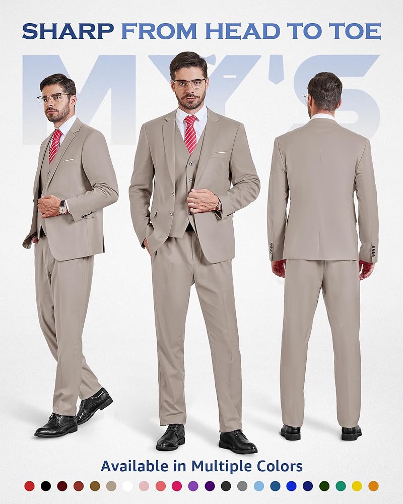 MY'S – MAN YOU'LL SUCCEED: Presents a full 3-piece slim fit suit ensemble comprising a two-button jacket, a coordinated vest, and pants. Complete with a silk tie matched to suit colors, available in sizes XS to XXL and 20 color options. These suits boast real pockets both inside and out, featuring exquisite chromed buttons. MY'S suits uniquely blend style, comfort, and affordability, distinguishing themselves.