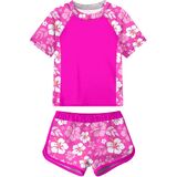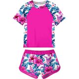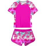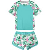 Feature: 2 piece girls swimsuit set, consists of short sleeve rash guard shirt and elastic waist swimming shorts. Rash guard can protect girl skin from sunburn, let girl enjoy summer freely