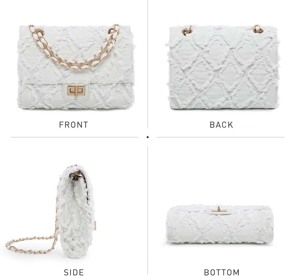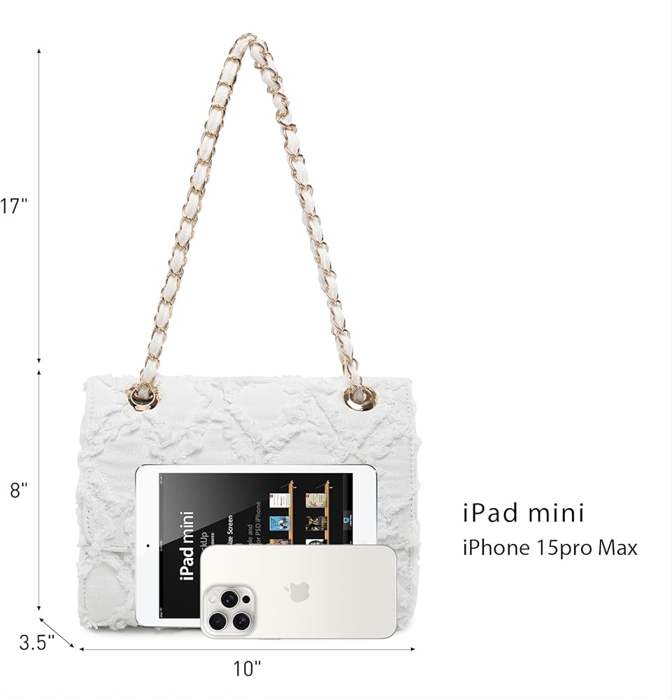 Material: Crafted from durable distressed denim in a trendy blue hue, this roomy bag boasts a beautiful quilted design for added flair. The gold-tone chain wrapped around the shoulder strap adds a luxurious touch to the overall look. Inside, you'll find a clean blue fabric interior with a convenient pocket and a large zippered compartment to keep your essentials organized.