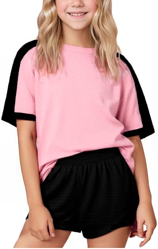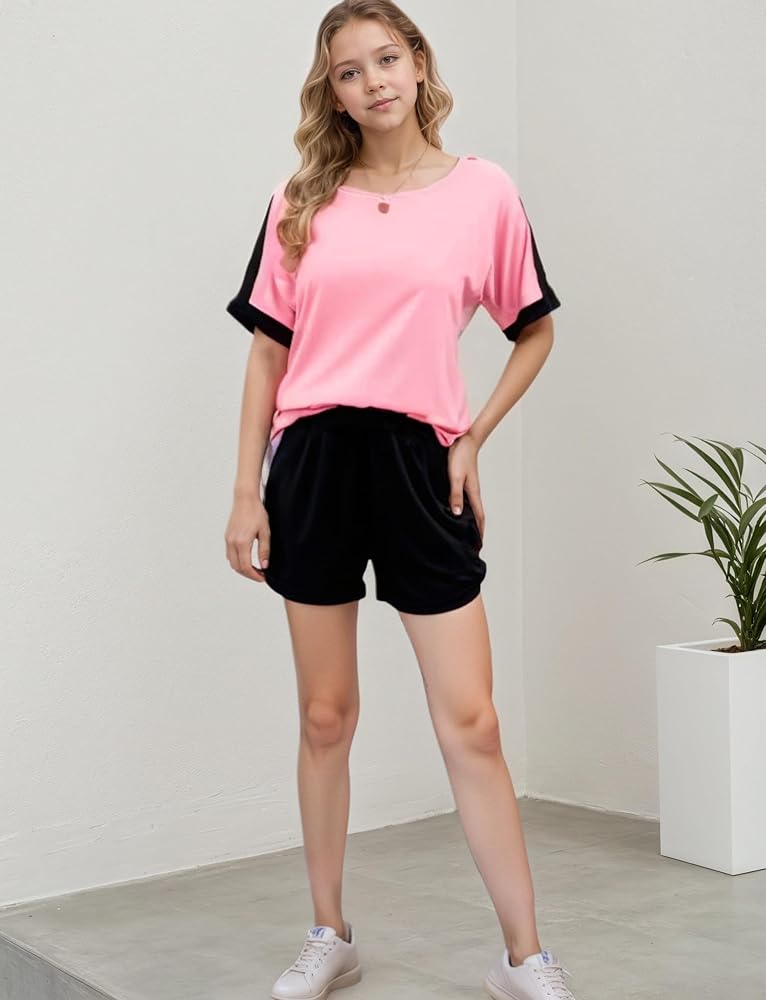 Design: Casual Short Sleeve Pullover Tops Matching Runner Shorts is loose casual style, short sleeve shirts, elastic waist shorts with pockets.ideal for all girls.