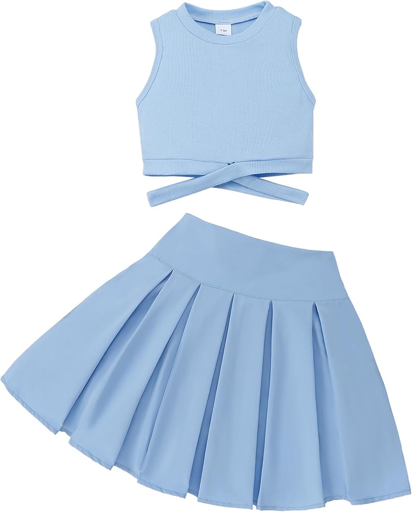Girls Fashion Clothes Design: This crop top for girls skirt set features stretchy ribbed crisscross tank top,wide waist pleated skirts. Preppy clothes design,presenting your kids energetic and cute appreance.