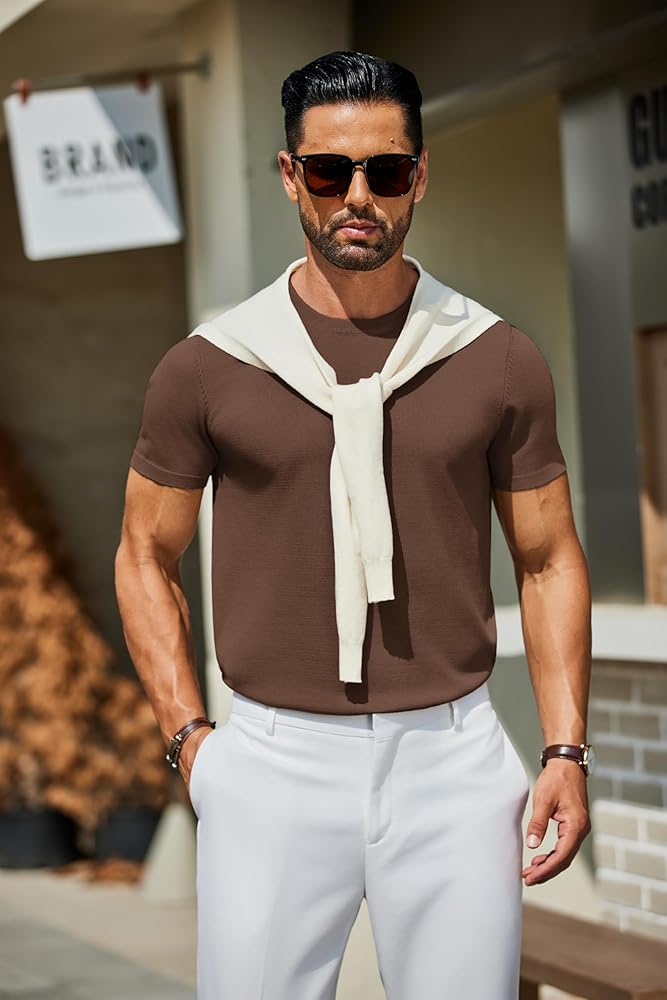 BASIC DESIGN: Men's classic knit t-shirts featuring crew neck, short sleeve, knitted fabric, solid color and horizontal stripe, ribbed edge. The men's short sleeve knitted sweater is a trendy addition to men's wardrobe.