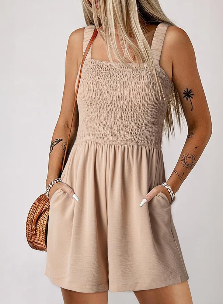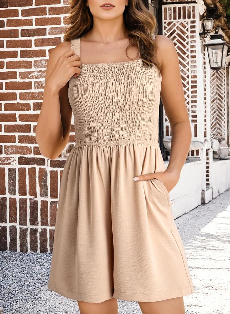 Match: Women's Summer Casual Smocked Rompers Great with jacket, sneakers, Sandals, Heels and Beach hat for outwear. A perfect jumpsuit for your summer. Wear a cardigan over wide leg rompers/dress on cool weather.