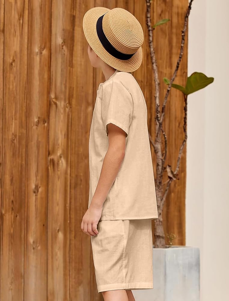 Design Features: The boy's 2 piece short set featuring a design with an henry collar, short sleeve, solid color, button-down closure, a chest pocket, 2 side pockets shorts, and elastic waist shorts. The solid color design is versatile and won't go out of fashion