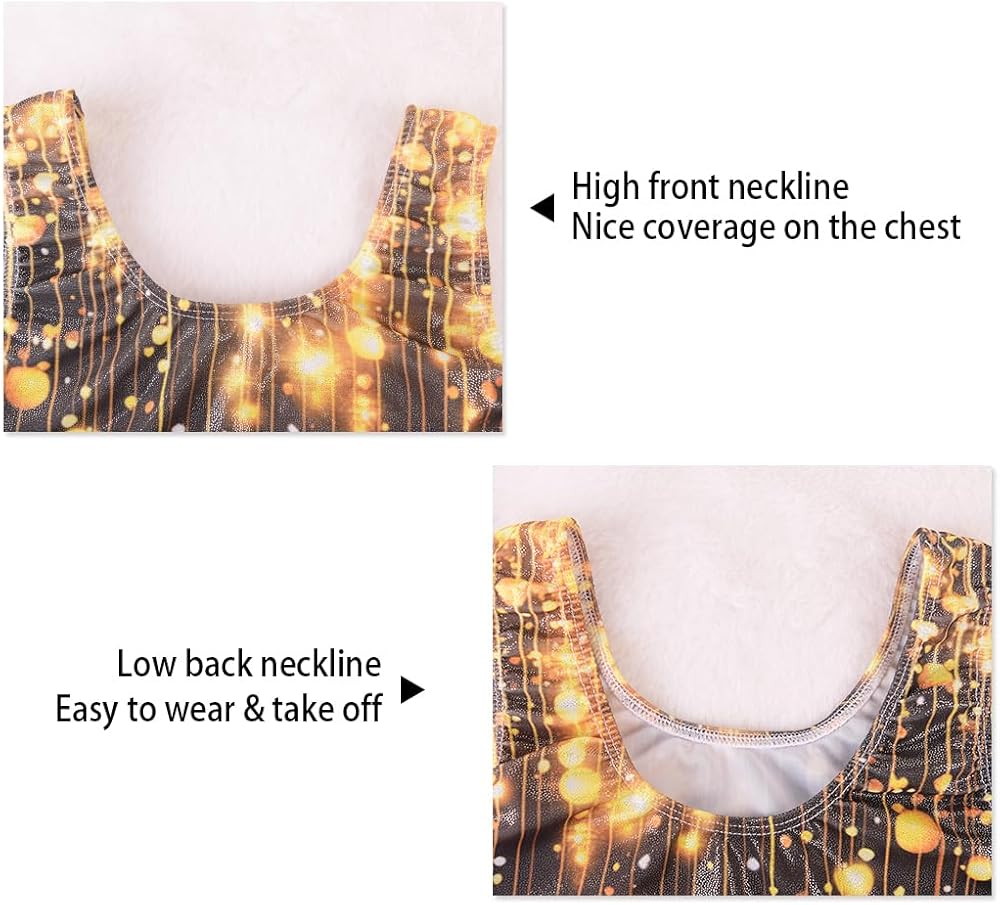 - Design:The neckline of gymnastics outfit higher than back.With tank sleeve and a round neckline,nice coverage on the chest,easy to take on and off