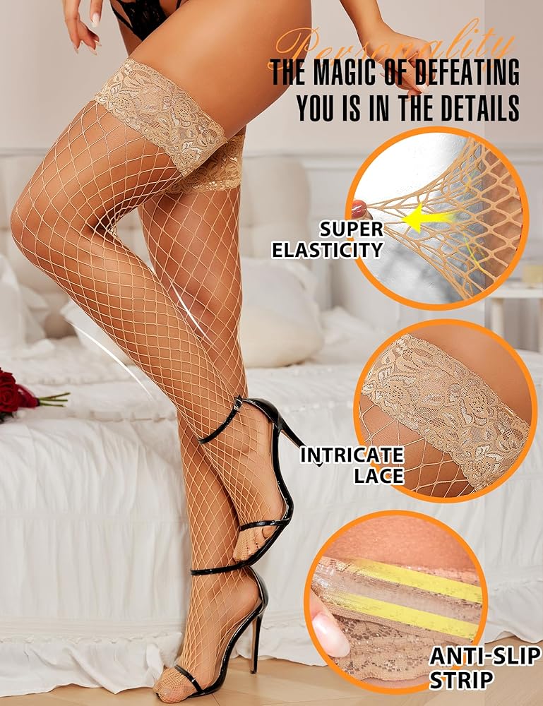 Intricate Lace Meets Bold Fishnet: The elegant lace tops combine with a striking fishnet pattern to sculpt your curves perfectly, adding a touch of refinement and irresistible charm. Delicate yet durable, this design of womens stockings brings out your natural beauty with a touch of exquisite craftsmanship.