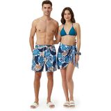 COUPLE SWIMSUIT SET: This couple swimsuit is divided into men's and women's versions. The women's version is a three-piece set, including a spaghetti-strap bikini top with adjustable ties, comfortable briefs and a printed cover up, matching print headband. The men's version is printed drawstring shorts, which are comfortable and breathable.
