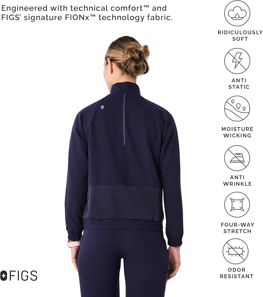 HIGH PERFORMING DESIGN — Engineered with Technical Comfort that incorporates moisture-wicking, anti-wrinkle, and Silvadur technology, which provides odor protection. The proprietary FREEx fabric is engineered from 92% recycled polyester and is ultra-lightweight, durable, anti-static, and water-repellent. Feel confident wearing the FIGS Sydney women's lightweight scrub jacket through these innovative design features that increase the lifespan and durability of the jacket.