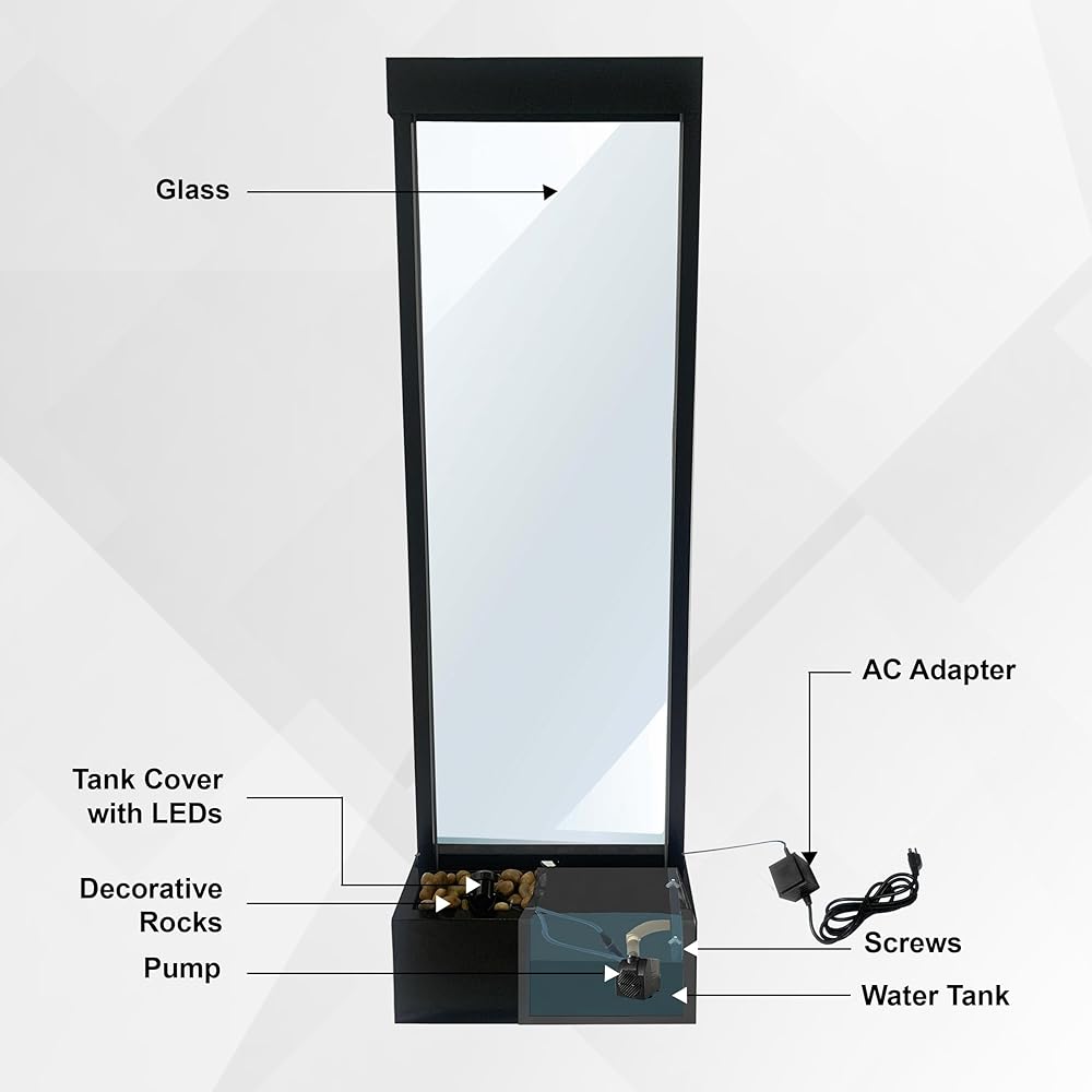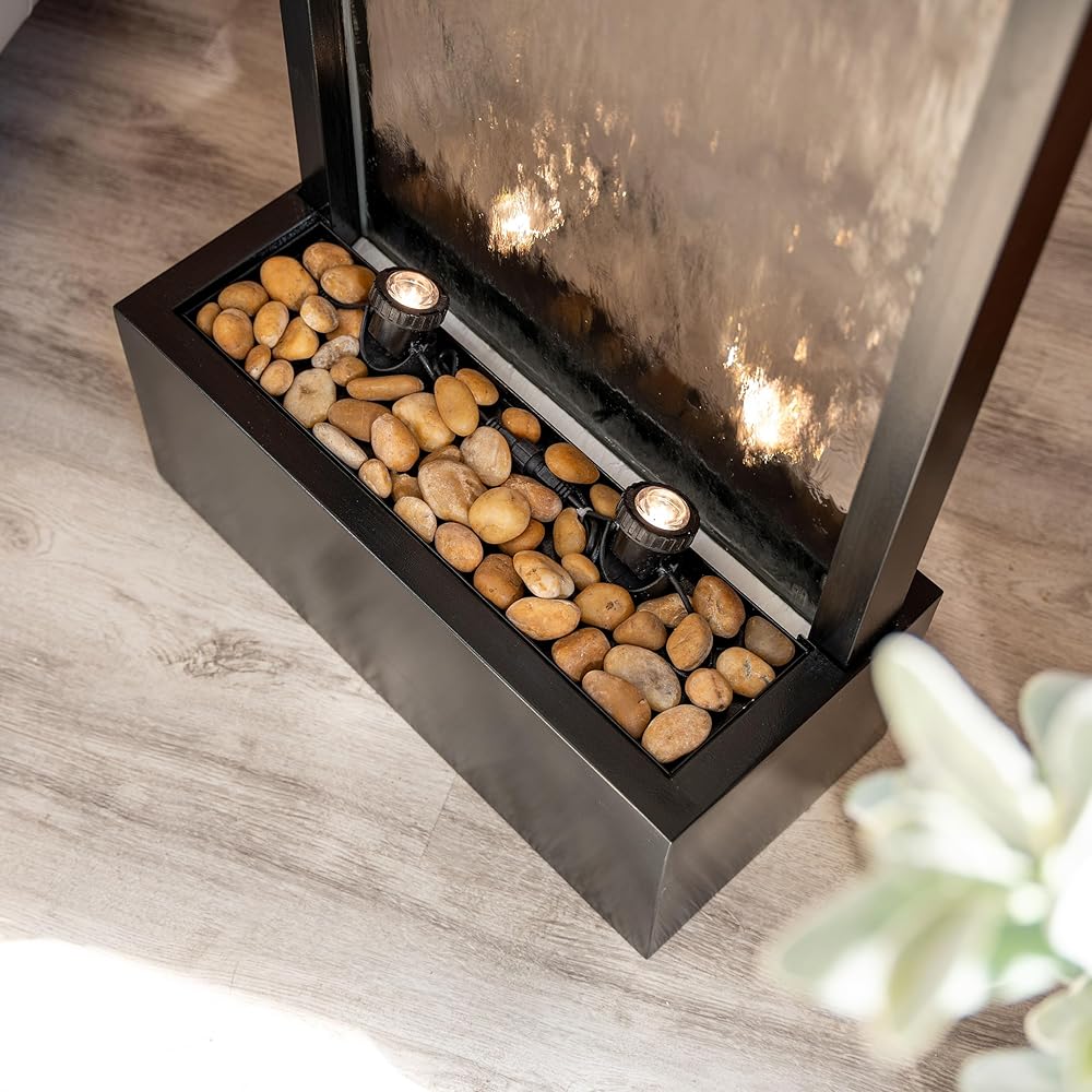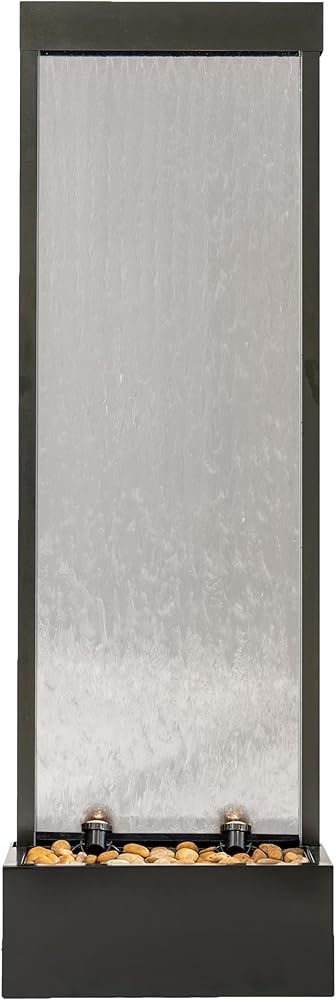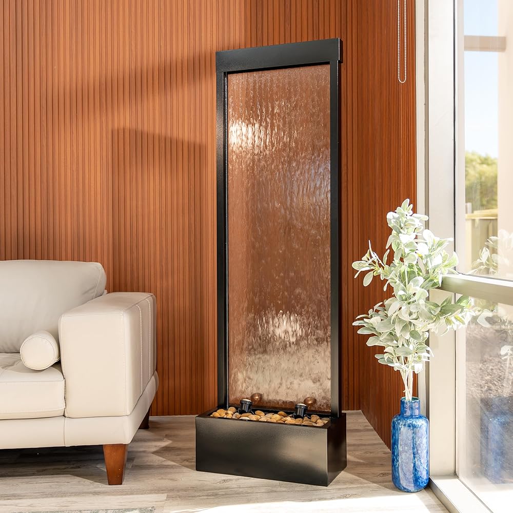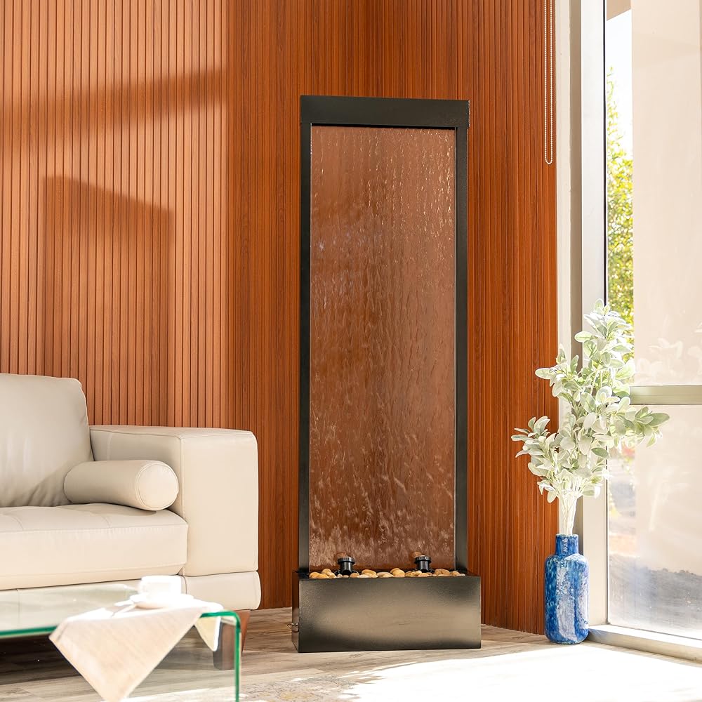 ELEGANT MODERN DESIGN WITH CASCADING WATER: Add sophistication and tranquility to any setting with this 68-inch freestanding waterfall fountain. Featuring a sleek stainless steel frame and clear glass waterfall, this modern bronze colored clear glass fountain creates a captivating cascading water effect. Decorative rocks at the base add a natural, stylish element, making it the perfect centerpiece for gardens, patios, offices, or living rooms.