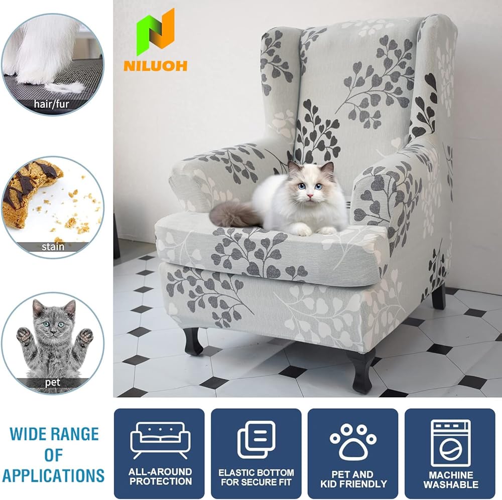 High Quality Wingback Chair Cover: This 2-piece chair cover is made of 92% polyester and 8% spandex. Durable, anti-wrinkle, anti-pilling, breathable, no fading, no pilling, smooth and wrinkle free, no need to worry about deformation for long-term use. The elasticity and strength are enough to perfectly adapt to most types of back chairs.